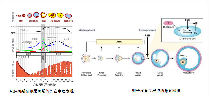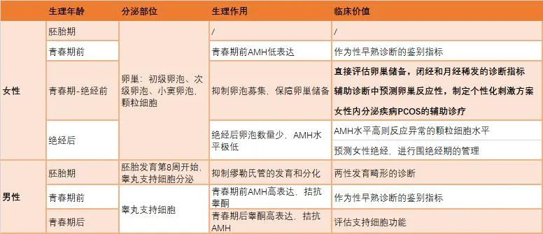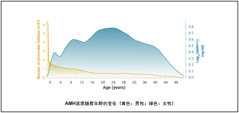 抗缪勒氏管激素 (Anti-Mullerian Hormone,AMH)最早发现于男性胎儿,因抑制其抗苗勒氏管激素的发育又被命名为抗苗勒氏管激素。从结构上讲,AMH是一个二聚体糖蛋白,隶属于转化生长因子β(TGF-β)超家族。其中,人类AMH编码基因位于19号染色体短臂。AMH是在男性胎儿中首先发现,其在胎儿性别分化中发挥重要作用,可以说Y染色体决定了性别分化的“里子”,但是AMH却决定了性别分化的“面子”。在胎儿发育过程中,胎儿的发育先后尽力了无性别时期,性别分化时期,AMH浓度变化促进了胎儿性别的分化。 △AMH在性别分化方面的作用 所以,AMH在临床上可被用来鉴别儿童性别发育异常,但这并不是我们今天要讲的重点,我们今天要讲的重点是AMH在女性健康方面的应用,目前AMH在临床应用的比较成熟的领域是生殖市场。 AMH是生殖健康很重要的一个指标,并且随着男性和女性的年龄增长出现一定的规律性变化。AMH作为一个日益成熟的项目,目前被应用在临床的多个领域,包括儿童性分化发育、女性生殖健康、男性生殖健康等等。02 卵巢是女性生育和美丽的基石