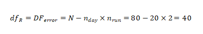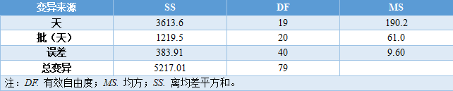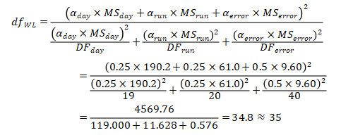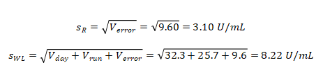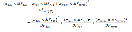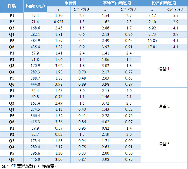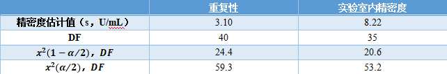 这是刘博谈准确度第八篇,本篇举例说明如何计算精密度。 7、举例说明如何计算精密度 7.1、重复性(批内精密度) 以丙氨酸氨基转移酶试剂盒产品其中一个批号试剂对低值样品进行测量为例,结果如表4.3.5所示。 表5|批内精密度实验原始数据记录表 表4.3.5中数据根据6.3.3标准进行分析显示无离群值。 根据公式(1)求出均值,均值为40.2 U/L,根据公式(2)计算出批内估计值的标准差。 丙氨酸氨基转移酶批内精密度为2.3%。 7.2、批间差 以白蛋白试剂盒产品为例,取3个不同批号的试剂,在质控合格的前提下对同一份样品进行测量,结果如表6。 表6|白蛋白试剂盒产品批间精密度实验原始数据记录表(单位:g/L) 表6中数据根据6.3.3标准分析显示3个批号测量白蛋白结果均无离群值。 根据公式(3)计算极差: 该白蛋白试剂盒产品的批间精密度为4.2%。 7.3、重复性和实验室内精密度(单点精密度)实例分析 本实例为单点精密度评价的数据分析,考虑到实验中可能会测量多个浓度样品,下面仅以其中一个样品的数据为例进行分析,原始数据记录详见表7。 实验设计遵循经典的20×2×2设计:使用一个试剂批号;使用一个测量系统;测试20天;每天测试2批;每批测试2次。 表7|超氧化物歧化酶( SOD )精密度评价原始数据记录表 (单位:U/mL) 80个数据来源于20天的重复测试,每批检测样品均来自同一份分装后的样品,可排除样品前处理或操作者的影响。无丢失数据,是一个平衡数据集。 为了观测异常结果,将每天每批每次重复测量的结果作图,如图1所示。 图1|超氧化物歧化酶精密度评价。代表20天每天2批、每批2次的测量结果,其中方形的点代表第一批测试结果,圆形的点代表第二批测试结果 从图1可以看出,无明显异常值。数据根据6.3.3标准进行统计分析,显示无离群值。 数据通过公式(4)~公式(8) 研究结果采用双因素嵌套方差分析,各变异来源的均方和结果见表8。 表8|超氧化物歧化酶方差分析结果 以上3种变异来源用来计算重复性SR和实验室内SWL的变异,即 重复性SR的自由度为 实验室内SWL的自由度为 80个测试结果的均值,变异系数为 精密度评价研究结果可用表9简单概括: 表9|超氧化物歧化酶精密度研究结果(重复性和实验室内精密度) 双因素95%置信限可通过公式(16)进行计算,将相关的DF、从公式(9)~公式(15)计算出来的结果输入,α = 0.05时超氧化物歧化酶样品的精密度置信区间如表10所示。 表10|超氧化物歧化酶精密度置信区间(95%,α = 0.05) 将上表中数据代人公式(16),得到重复性精密度、实验室内精密度在置信区间的上下限,如下所示: 以上为标准差,转化为CV需除以测量均值229.5 U/mL,再乘以100%,则精密度区间分别为:重复性1.1%~1.7%;实验室内2.9%~4.7%。 7.4、设备间精密度实例分析 下文介绍的设备间精密度(或多点精密度)研究模型为3台设备(或3个实验室)、多个浓度水平的样品精密度评估模型检测人血清中碱性磷酸酶(ALP)催化活性浓度。 3台设备均使用相同的样品。进行6个浓度样品的检测实验,临床混合样品按浓度由低到高依次标记为P1、P2、P5,同时采用的质控样品为Q3、Q4、Q6,原始数据详见表11。 表11|ALP 精密度评价原始数据记录表(单位:U/L) 数据通过公式(17)~公式(20)采用嵌套方差分析,各变异来源的均方计算结果如表12。 表12|ALP 精密度研究6个样品方差分析结果 利用表12数据通过公式(21)~公式(23)计算各样品的Verror、Vday、Vsite等,结果如表13所示,其中的百分比表示各分量方差占总方差百分比。 表13|ALP 精密度研究6个样品双因素嵌套方差分析结果 表13的数据再经过公式(24)~公式(26)计算,可得出各设备(实验点)的重复性、实验室内精密度、设备间精密度等数据,详见表14。 表14|设备间(实验点)精密度评价结果 以设备1的重复性为例,不同样品浓度为x轴、对应的重复性为y轴作图,绘制ALP的精密度曲线,如图2所示。 图2|ALP 不同浓度样品对应的重复性曲线(设备1) 表14的数据再经过计算,可得出各个样品测定的重复性、实验室内精密度和设备间精密度的95%置信区间,详见表15。 表15|ALP 各样品95%置信区间 8、方差齐性及Satterthwaite公式的应用 EP05-A3中涉及的方差分析为嵌套方差分析(也有称为巢式方差分析),其有效自由度的计算公式来源于Satterthwaite公式,下文对其进行简要介绍。 在进行方差分析时,理论上要求两个相应总体的方差相等,即所谓方差齐(homogneity)。即使两总体方差相等,也可能由于抽样误差导至两个样本方差不同,此时可进行方差齐性检验。 在进行两个独立样本的t检验时,常可出现方差不齐现象。 如果方差不齐,就要按照方差不齐的统计学方法进行样本处理,又称为t’检验(亦称近似t检验)。 方差不齐的处理方法有多种,如Cochran & Cox法、Welch法、Satterthwaite法等,Cochran & Cox法是对临界值校正,Welch 法和Satterthwaite法是对自由度进行校正。 Satterthwaite 法是应用较多的方法,有文献将校正后的 t 由度又称为有效自由度。 EP05-A3和EP15-A3中主要利用Welch - Satterthwaite公式得到校正的自由用来决定精密度验证允许上限的F值。下文结合单点精密度部分公式(9)公式(15)内容介绍Welch - Satterthwaite公式的应用。 Welch - Satterthwaite原始公式为 根据公式(9)~公式(15)可推导出以下公式: 将公式(34)通分整理后得公式(35): 根据Welch - Satterthwaite公式建立的原理,可得到以下公式: 从而得到公式; 以上为20×2×2单点精密度实验模型有效自由度的推