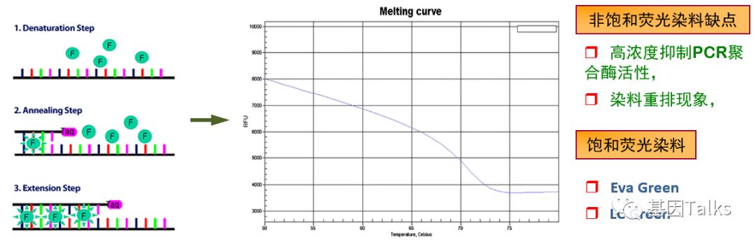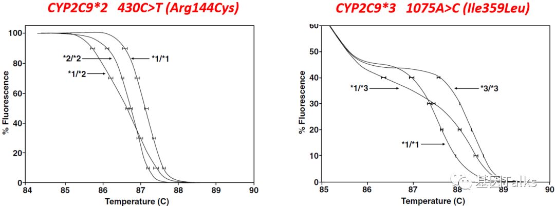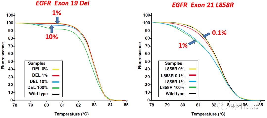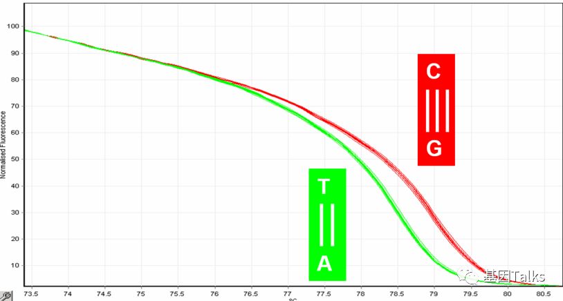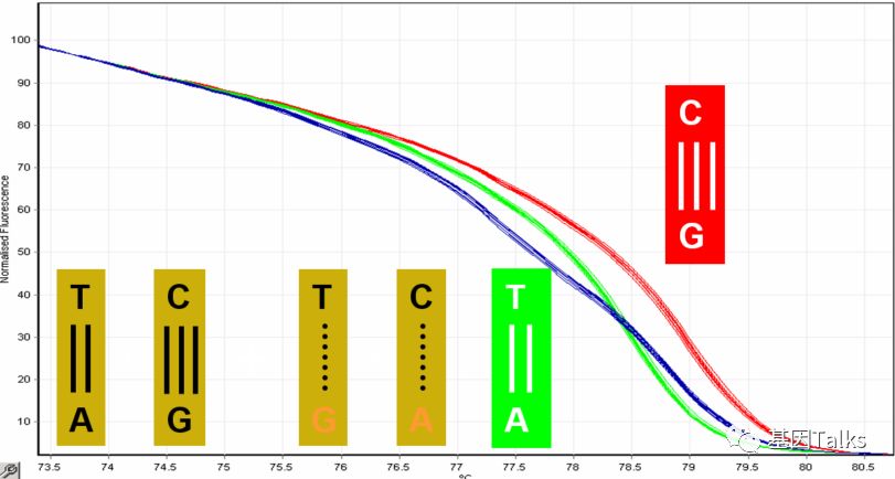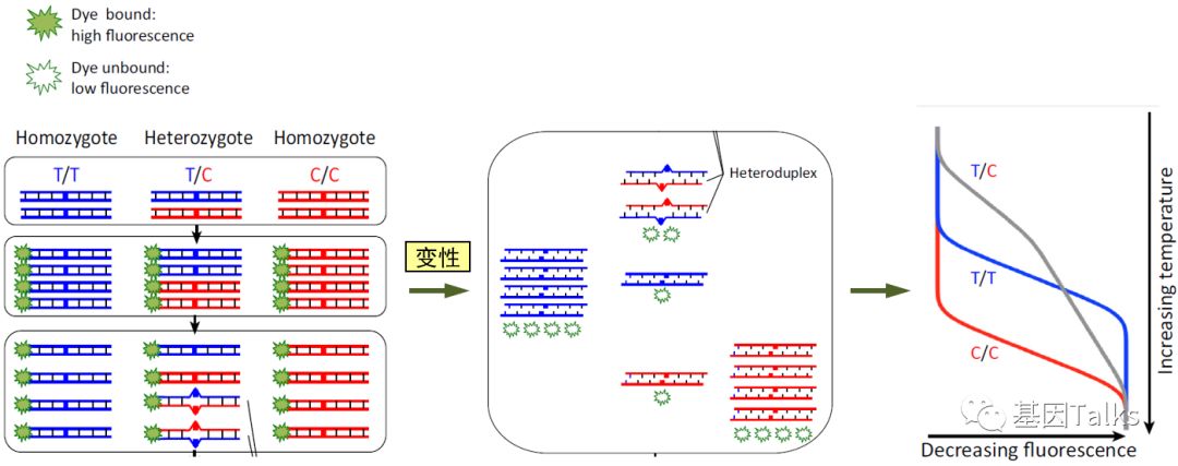 前 言 基因的变异类型有多种(点击查看),对应的分子检测方法亦有多种,当前资本市场驱动着分子检测市场,并极力追捧NGS技术,因为其通量高,灵敏度高且性价比高。小编承认NGS是分子检测的必然发展趋势,但是短时间内,NGS并不会取代其他分子检测方法,因为针对不同的需求,都有对应的理想检测方法,每个检测平台都有着自己的优势,比如: 操作简单:PCR,ARMS-PCR,HRM等 时间快速:ARMS-PCR,HRM等 成本低:PCR,PCR-RFLP,MassARRAY等 准确:Sanger等 通量高:NGS等 灵活性:Pyrosequencing等 结果分析简单:ARMS-PCR等 自动化:核酸提取等 ...... 小编一直认为:没有最好的技术,只有最合适的技术!最好的,不一定是最合适的;最合适的,才是真正最好的。 今天,我们聊一聊HRM技术,首先,我们先了解下什么是HRM? HRM:高分辨率熔解曲线(High-resolution melting curve, HRM)。PCR扩增的融解曲线取决于其扩增序列,序列中一个碱基的突变都可以导至双链DNA的解链温度发生变化,通过使用实时荧光定量PCR仪监测这种细微的温度变化(但是这个差异极小,只有零点几摄氏度,如果仪器的分辨率不高,是根本无法检测的),可以知道扩增的序列中是否有突变发生,从而对其进行基因分型。 HRM实施的基础是不同核酸分子物理性质的差异,通过实时跟踪、收集升温过程中饱和荧光染料与PCR产物结合的信息,并进行软件分析形成溶解曲线。温度低时,染料结合牢固,荧光信号强;升高温度,DNA双链解开,荧光染料随之解离,荧光强度减弱。当温度达到Tm值,50%的双链DNA解成单链,荧光信号强度达到最低。 HRM检测原理 常规实时PCR使用的是不饱和SYBR Green染料,由于这种染料对PCR有抑制作用,所以使用浓度必须远低于使DNA双螺旋结构中小沟饱和的浓度。该技术难以保证染料与所有PCR产物结合,影响了检测的分辨率(不饱和染料在dsDNA解链时,荧光分子重新结合于未解链的dsDNA部位,荧光信号没有变化,不能反应样品熔解温度)。目前HRM使用的是一类与DNA结合能力更强和对PCR抑制作用更小的饱和染料(因为它们即便在饱和浓度(荧光最大)下,也不会抑制PCR),如Eva Green、LC Green、SYTO9等(饱和染料在dsDNA解链时,荧光分子同步脱落,信号减弱)。因为饱和染料的使用,大大提高了HRM在单碱基突变、小片段插入/缺失方面检测的灵敏度和分辨率。 HRM技术对实验仪器的温度分辨率要求相当高,需要达到0.02~0.1℃,每升高1℃采集荧光25次,以满足对单碱基差异的区分。HRM对温度均一性同样要求较高,Tm的标准偏差为0.020-0.264℃(孔间温度均一性要达到0.264℃以内才能保证HRM分析结果的准确性),一般PCR两孔间温差在0.3~0.5℃,这就导至两孔间最终溶解温度相差较大,无法保证HRM分析结果的准确性。(做HRM的话一般Roche的LightCycler 480可以考虑,公用热室,可以保证单次PCR各反应管间温度的均一性,而且有特殊的模块加热技术及快速散热装置) 基因型一般有三种,野生纯合,杂合,突变纯合。首先变性,双链解开,接着退火(假设60℃),此时引物结合模板,然后在Taq DNA聚合酶的作用下继续延伸(假设72℃),此时所有的饱和荧光染料嵌和在双链中,荧光信号很强,接着再变性,此时的HRM监测的是72℃-95℃之间的温度变化(直观的就是荧光染料的信号强度变化)。HRM得以区分单碱基差异是建立在DNA碱基本身的特性上的。G/C碱基对由三个氢键连接,A/T碱基对由两个氢键连接,打断三个氢键较打断两个氢键需要更高的能量,体现在G/C碱基对具有更高的Tm值,也就是说多态性位点为G/C的双链其熔解的发生较多态性位点为A/T双链更晚(见下图1)。比如上图现在是T>C,那么野生纯合是蓝色线,突变纯合是红色线,杂合是红蓝混合色(灰色),由于CC和TT是同源双链,那么CC跟TT型根据Tm很好区分,由于CT中会出现异缘双链,这就会出现四种配对方式:AT,CG,GT,AC(见下图2),其中AT,CG的混合使杂合型的熔解曲线表现为前两种熔解曲线的整合形,而GT,AC的错配双链使它的熔解曲线更趋向低温区,综合以上使杂合型的熔解曲线与纯合型的熔解曲线呈现交叉。(注:也可参考上篇ARMS方法设计引物,使用两种不同的等位基因特异性正向引物,正向引物3'端的最后一个碱基对应于SNP位点的二等位基因,反向引物都一样,并使用荧光染料来检测PCR产物。纯合子基因组DNA只能被与其完全匹配的正向引物扩增,而杂合子基因组DNA能同时和两种正向引物结合扩增出两种PCR产物,这就可以很直观的理解出四种配对的方式了) 图1. G/C碱基对比A/T碱基对具有更高的Tm值 图2. 杂合子溶解曲线由四种配对方式混合而成 结果解读:允许在熔解相的前后进行充分的数据收集。在围绕所观察到的Tm值上下超过10°C(甚至更大)的温度窗口内捕捉HRM数据值。这为有效进行曲线的标准化提供了足够的基线数据值,可促进形成更为紧密的复性数据并且能够更轻松地进行数据解释。 HRM本质 HRM的数据分析是通过比较不同样本之间熔解曲线的位置和形状上的差异,来对基因型进行区分的。标准的HRM软件包能够将样本熔解曲线的形状和位置与对照进行比较。这一方法可能导至产生难以解释的不可靠结果,因此有时可能必须要进行耗时的人工数据解释。 当然,并不是每种SNP用HRM都好区分的,根据碱基变异的类型,SNP可化分为四个等级,其中第IV类SNP即A/T变异,由于其Tm变化非常小(<0.2℃),被公认为是最难检测的SNP类型,此时可以看看市场上的商品化试剂盒,比如Qiagen的,好像有一款是可以做到A/T的。 SNP可化