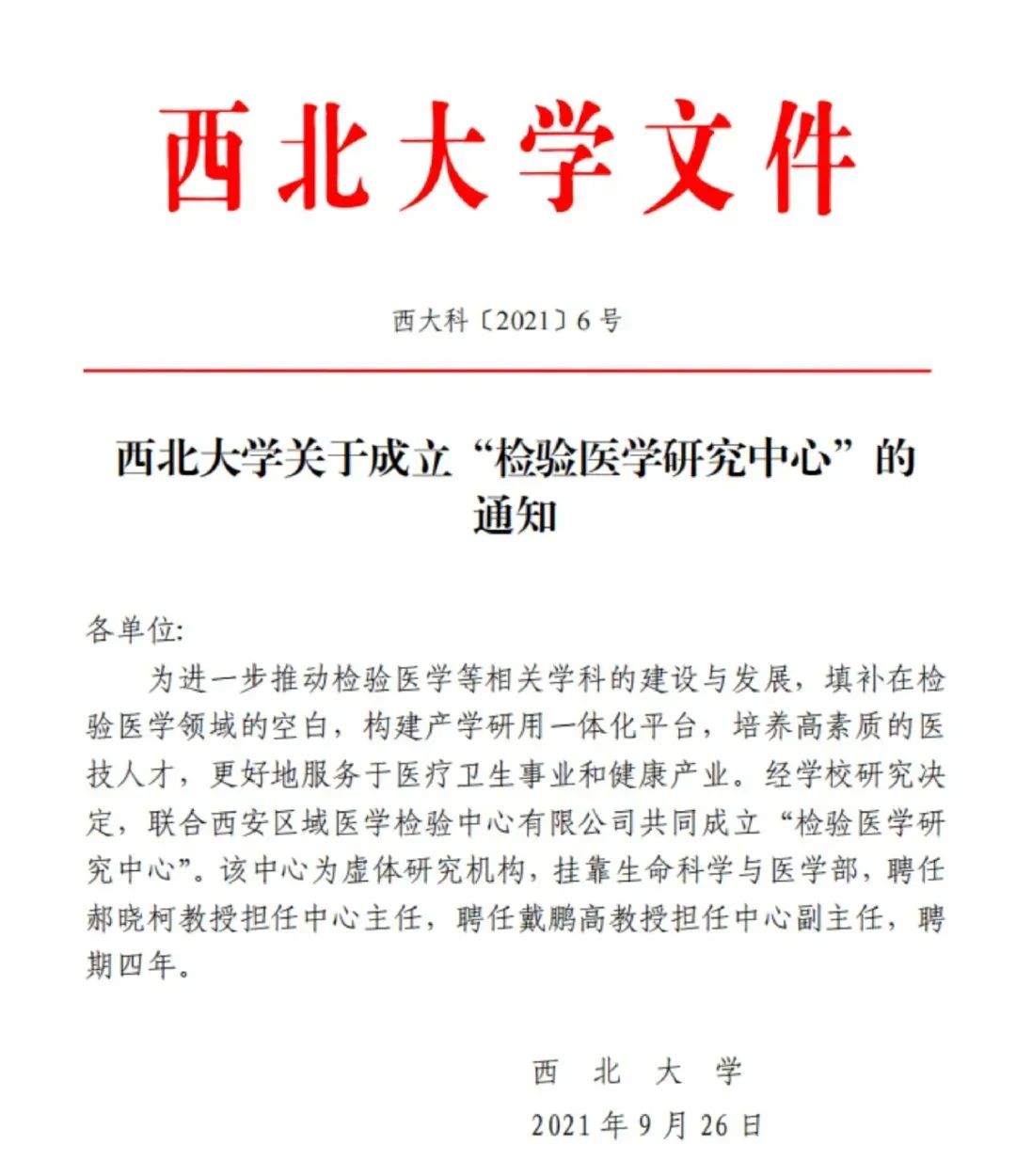 2021年9月26日,西北大学发布《西北大学关于成立“检验医学研究中心”的通知》,该校联合西安区域医学检验中心有限公司共同成立“检验医学研究中心”(以下简称“中心”),旨在进一步推动检验医学等相关学科的建设与发展,填补在检验医学领域的空白,构建产学研用一体化平台,培养高素质的医技人才,更好地服务于医疗卫生事业和健康产业。