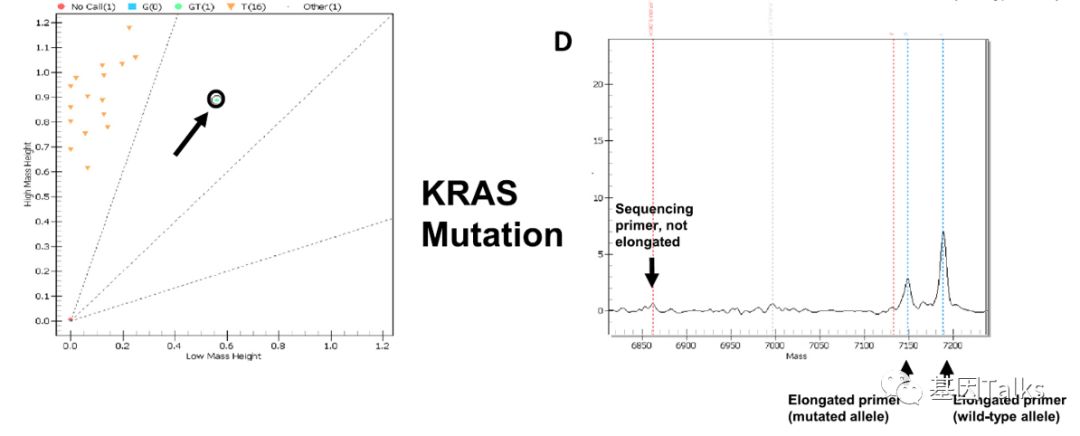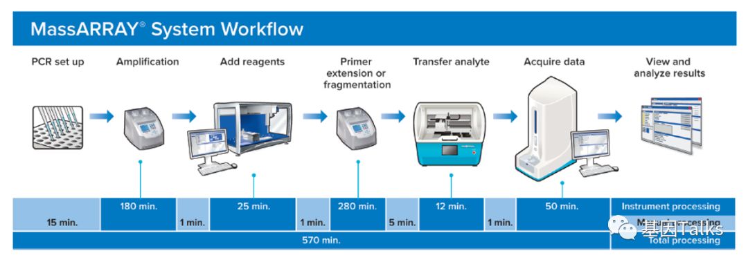 前 言 基因的变异类型有多种(点击查看),对应的分子检测方法亦有多种,当前资本市场驱动着分子检测市场,并极力追捧NGS技术,因为其通量高,灵敏度高且性价比高。小编承认NGS是分子检测的必然发展趋势,但是短时间内,NGS并不会取代其他分子检测方法,因为针对不同的需求,都有对应的理想检测方法,每个检测平台都有着自己的优势,比如: 操作简单:PCR,ARMS-PCR,HRM等 时间快速:ARMS-PCR,HRM等 成本低:PCR,PCR-RFLP,MassARRAY等 准确:Sanger等 通量高:NGS等 灵活性:Pyrosequencing等 结果分析简单:ARMS-PCR等 自动化:核酸提取等 ...... 小编一直认为:没有最好的技术,只有最合适的技术!最好的,不一定是最合适的;最合适的,才是真正最好的。 现在,质谱分析在医学临床诊断和研究方面变得非常普遍,我们可能经常会听到用XX质谱分析在临床检验某种遗传代谢性疾病,提及质谱我们一般都会想到气相色谱质谱联用、串联质谱、遗传代谢病、代谢组学(有机酸、氨基酸、脂肪酸等)等。但是当有一天,我们听到用质谱检测核酸的时候,是不是会有一种错觉?这么“粗糙”的质谱能检测这么“精细”的核酸分子? 对,没错,有一款质谱可以检测核酸分子,它就是基质辅助激光解吸电离飞行时间质谱,MassARRAY-MALDI-TOF-MS! 今天,我们聊一聊MassARRAY技术,首先,我们先了解下什么是MassARRAY? MassARRAY:基质辅助激光解吸电离飞行时间质谱(Matrix assisted laser desorption/ionization time of flight mass spectrometry, MALDI-TOF-MS) ,在基质辅助下使结合后的分子发生电离,产生的离子在电场作用下加速通过飞行管道,它们的质量和所带电荷可以影响其飞行时间,因此,根据它们到达检测器飞行时间的不同对待检测物进行分离。 MassARRAY检测原理 MassARRAY飞行质谱的原理是样品分析物与芯片基质(硅化合物)共价结合形成结晶后在质谱仪的真空腔中经高能激光激发,核酸分子解吸附为单电荷离子;在电场中离子飞行时间与离子的质量成反比相关,通过检测解吸的核酸分子在真空腔中飞行的时间从而计算获得样品分析物的精确分子量,进而得到分析物的基因型信息。该平台使用的是垂直飞行模式。 MassARRAY平台的iPLEX检测基因分型的原理是,对PCR扩增的目标序列,进行MassEXTEND单基因延伸反应,该反应是紧挨着SNP位点设计一段探针,在反应体系中以ddNTP替代dNTP,使得探针在SNP位点处延伸一个碱基即终止,在反应体系根据SNP位点的不同,探针将结合不同的ddNTP,生成不同分子量的产物。延伸的产物与芯片基质结合形成化合物后再通过飞行质谱进行基因型分析。 DNA甲基化检测原理:MassARRAY分子量阵列基因分析系统EpiTYPER DNA甲基化分析技术结合了碱基特异性酶切反应(MassCLEAVE)和MALDI-TOF测序原理。与其他测序方法检测DNA甲基化一样,MassARRAY平台也是应用经过亚硫酸盐处理,DNA中的未甲基化的胞嘧啶(C)转为尿嘧啶(U),而甲基化的胞嘧啶不会发生改变,甲基化的胞嘧啶和未甲基化的胞嘧啶(转变成U)由于分子量不同,因此可以区分。利用5,末端带有T7启动子的引物进行PCR扩增,产物经虾碱性磷酸酶(SAP)处理后,转录并进行碱基特异性的酶切反应(MassCLEAVE),最终生成不同分子量的检测产物(图3)。酶切后DNA片段的大小和分子量取决于亚硫酸盐处理后碱基的变化。 实验流程简单解析 2,通过PCR引物扩增后,可以进行目的片段的富集。 3,PCR扩增后,我们需要进行SAP消化,去除多余的酶、buffer、mg2+、dNTP等试剂。 4,杂交延伸扩增。 5,单碱基延伸扩增(以A/T/C/G终止)。最后我们通过质谱检测单碱基的峰图便可以直观的读出结果。 由于MassARRAY技术细节比较多,本篇篇幅可能不够介绍,感兴趣想深入学习的小伙伴可以点击下方的链接进行查看: 4,MassARRAY平台项目设计 。 实例1:比如现在有一名结直肠癌患者,考虑是否使用西妥昔单抗,对KRAS 61号突变进行检测。 KRAS T/T野生型 KRAS G/T突变型 实例2:MassARRAY最大的优势就是其通量高,一管可以实现多个基因位点的检测,比如下图中17种基因型可以一次性检测(有些基因型不是对应一个SNP位点,所以左图下角有19个峰值)。 一管可以一次性检测多种基因型 优点: 1,通量高; 2,成本低; 3,组合灵活; 4,灵敏度高。 缺点: 1,需要特殊的仪器设备; 2,不能检测未知的突变; 3,每次检测样本和位点数有一定要求。 此方法适宜于有相关仪器的实验室,大量样本同时进行多位点分型检测。 |