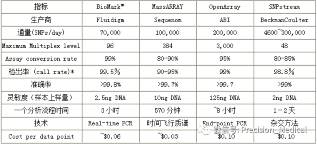 如果你是精准医学的爱好者,如果你是分子生物的专家者,如果你是种群进化的探索者,如果你是单基因遗传病的检测者,如果你是复杂疾病的GWAS研究者,如果你是... 那么关于SNP的检测方法及技术平台你是否了解呢?小编根据市场上检测SNP通量高低的技术平台进行了大致的划分: 今天主要介绍Fluidigm BiomarkTM HD System + Fluidigm EP1TM System + Fluidigm JunoTMSystem 检测SNP的原理及过程,JunoTM作为最先进的高通量样品制备系统及综合上样器,可与EP1TM和BiomarkTM HD系统配套使用,与分型、数字PCR等各种微流控IFC芯片适配,快速完成多样本、纳升级的自动化上样过程。 利用JunoTM 和 EP1TM、BiomarkTM平台可以灵活地设计从预试验到常规工作的实验系统。 背景介绍 美国Fluidigm公司(www.fluidigm.com)创立于1999年,总部设在美国加州。 1998年加州理工大学的Stephen Quake教授发明了核心技术——微流控阀门(Valve),随后,Stephen Quake(首席顾问) 和 Gajus Worthington(公司CEO) 在1999年成立了Fluidigm公司,Fluidigm公司最核心的技术就是它的微流控阀门技术,这个阀门的材料是一种软胶状的材料,它受电信号的控制,可以打开,或者关闭微流路,这样就起到了控制微小液流的效果。Fluidigm进行用于生物技术研究的微流控芯片及硬件的开发和销售,技术支持。 Fluidigm高通量基因分析系统(BiomarkTM和EP1TM)自上市以来得到了全球各个研究领域科学家的认可和赞誉,2014年,它又推出了全新的SNP基因分型平台——JunoTM系统,它能在不到3小时的时间内处理并完成低至2.5ng/ul的DNA样本的SNP基因分型。 Biomark™ HD系统 Biomark™ HD系统:本质上是一个基于微流控的、高通量的实时定量PCR系统;是集成流体通路(Integrated Fluidic Circuit,IFC)技术、实时定量PCR技术及强大的基因分析软件相结合的技术平台。 核心技术:Biomark™ HD系统的核心技术就在于将实时定量技术集成了流体通路技术:利用集成电路制作工艺(光刻)在硅片或石英玻璃上刻上许多微管和微腔体做成阵列芯片,并通过独立的纳米级微型阀门控制溶液在阵列反应仓(Reaction Chamber)中的流动来实现生物样品的分液、qPCR体系混合建立,并实现高效准确地实时PCR扩增、检测。 系统组成:Biomark™ HD基因分析系统由Bio-Mark™实时PCR系统(整合了高性能计算机)、IFC微液流芯片(耗材)、IFC Controller(或者称Loader,将生物样品、反应试剂导入到IFC微液流芯片中)和数据分析软件四部分构成。 核心部件1:BioMark主机是一个同时拥有热循环功能和拍照成像功能的仪器。它每走一个Cycle,就对IFC拍一张照片,也就是说,它是一台实时荧光定量PCR仪,不同的是,BioMark这个主机,它加热的是Fluidigm的芯片,而qPCR仪上加热的一般是96/384板。 核心部件2:Biomark™ HD系统的核心部件就是微流控芯片,此芯片有如下几种不同格式,满足不同SNP位点和样本数的研究需求,分别为Flex Six 12*12 IFC(12 Samples *12 SNPs),48*48 IFC(48 Samples *48 SNPs),96*96 IFC(96 Samples *96 SNPs),192*24 IFC(192 Samples *24 SNPs),其中Flex Six 12*12 IFC有6个不同的分区,这6个不同的分区可以单独或同时运行,组合比较灵活,同时也可以自己跟Fluidigm公司定制芯片,比如国内某公司定制的24*192 IFC(24 Samples *192 SNPs),不同格式检测芯片如下图: 注释:rxns=reactions,就是把reaction缩写为rxn 20rxns,就是能做20反应 此芯片由三部分组成,以48*48(48 Samples *48 SNPs)IFC为例来介绍: 芯片左侧,是一组48小孔,每个小孔当中可以放一种等位基因qPCR的ASP Master Mix,也就是Assay反应液。 芯片右侧,也是一组48小孔,每个小孔当中可以放一个样本溶液,也就是Sample预扩增稀释样本。 芯片中央部分,是阵列反应仓(reaction chamber),微流路把Assay溶液和样本溶液引入到每个chamber小孔中,在这个微流路上,设置了一系列的阀门,这些阀门,可以保证Assay反应液和样本溶液分别进入相对应的反应仓,然后进行qPCR反应。 核心部件3:操作过程中,需先用移液器,把Assay反应液和样本溶液加入到小孔当中;接着,IFC Controller通过微流控的阀门控制,将生物样品、反应试剂导入到IFC微液流芯片中的每个chamber小孔中,然后,把这张芯片放到BioMark的热循环仪上,进行实时定量PCR反应。 EP1™ 系统 EP1™ 系统:EP1™系统跟Biomark™ HD系统类似,不多做赘述,EP1™高通量基因分析系统由EP1™ Reader PCR仪、IFC微液流芯片(耗材)、IFC Controller(将生物样品、反应试剂导入到IFC微液流芯片中)和基因分析软件四部分构成。 JunoTM系统 JunoTM系统:Fluidigm公司于2014年下半年推出了Juno机器,Juno系统第一次使用了一种微流控芯片技术,它在一块芯片上整合了加样、预扩增和PCR基因分型,做完PCR基因分型之后,用终点荧光法来进行扫描。可以用BioMark机器进行扫描,也可以用EP1机器进行扫描。其中,EP1机器是一个终点法的扫描仪,没有热循环功能。 Juno系统为了解决传统SNP基因分型实验的限制,新的芯片只需要5.5ng的DNA,浓度为2.5ng/ul。Juno平台在降低使用开放型的微量滴定板做多步骤的实验流程中存在的错误和PCR污染的风险的同时,大大缩短数据采集的时间。 虽然市场上的其他解决方案需要多次动手步骤并且从样本到数据的时间至少是5小时,但是一步法的,全自动的Juno系统的工作流程只需要15分钟准备试剂,在不到3小时的时间内就能拿到数据。 Juno平台的灵活性和易用性将使核心实验室可以简单地满足许多不同客户的需求,并且系统在一块芯片上整合预扩增和基因分型的能力将使临床实验室能经济地从低