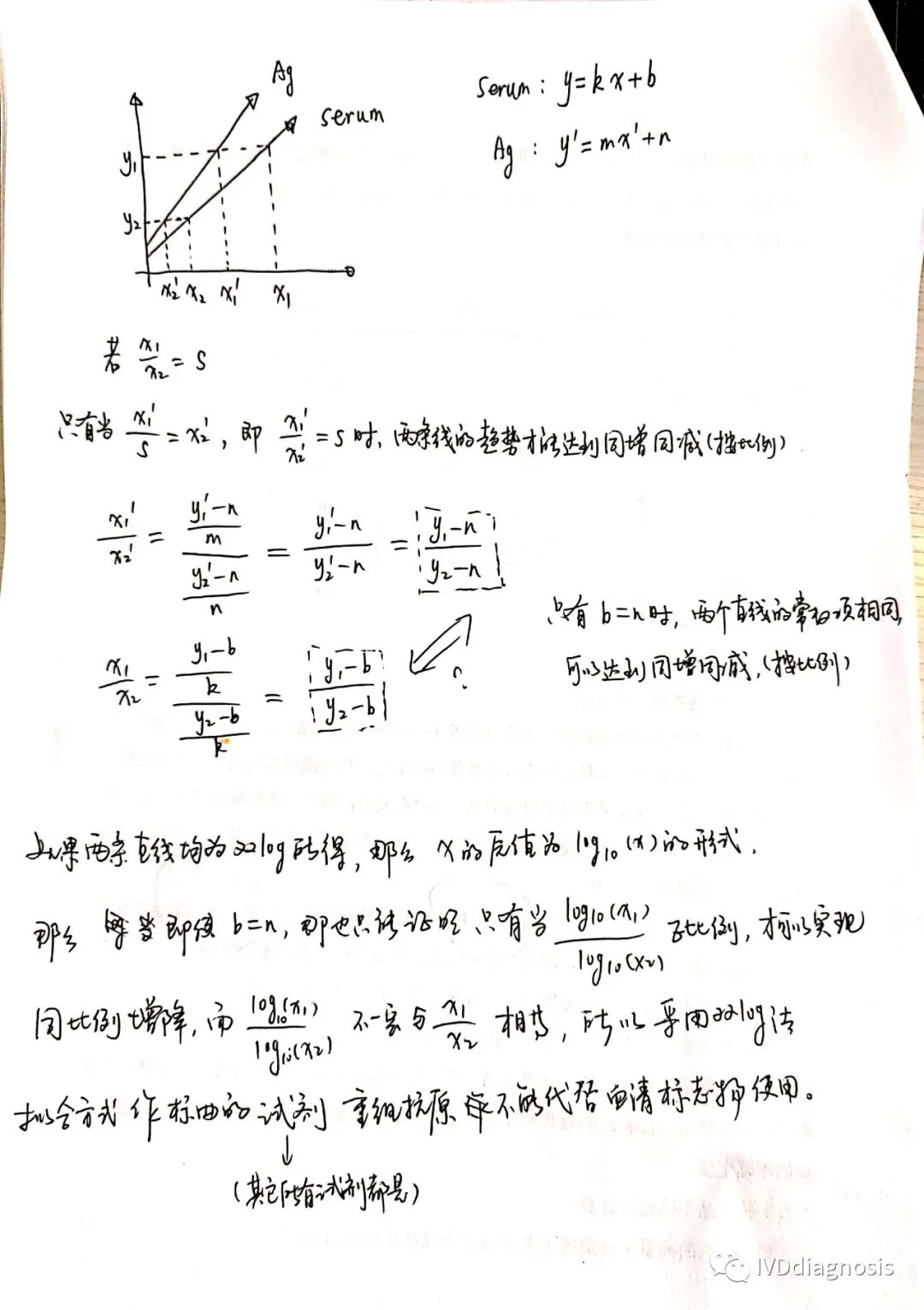很多做IVD的研发新手开始做研发的时候,都会面临一个问题——标准品。 标准品既可以是国际或者国家可以直接采购的标准品,也可以是赋值过的血清,很多人为了图省事,直接采用重组抗原配制。那么重组抗原是否可以替代血清使用呢?其实,大多时候是不可以的。重组抗原毕竟是重组的,它的分子大小、蛋白折叠、位点丰度等等其实是和血清中实际的标志物状态有很大差别的。很多新手在搞研发的初期,都习惯用重组抗原代替血清,等真正试剂走向临床并投诉很多的时候,你再用真实样本去复合,会发现,检验科大夫并没有冤枉你。 为什么呢?其实很简单。上面提到了,重组抗原虽然和血清标志物有某几个相同的位点,但是在分子大小、蛋白折叠、位点丰度等方面还是有很大不同的,所以我们用重组抗原做标准曲线去给血清标志物去定值,显示是不成立的。我们举个例子,我们用血清标志物和重组抗原分别梯度稀释作为x,发光值为y,做两条线,假如两者都是最简单的直线,血清(y=kx+b);抗原(y=mx+n);你会发现,这两条直线的走势和截距大概率是不一样的。我图片中还通过数学的方式验证了,只有当两者的截距相同的时候,才可以达到同比例的增减,这时两者才可以完全做到相互代替,但是这种情况是随机的,很难保证b=n,不过可以通过调整b和n的相近程度,来达到替代。总的来说,如果两者都是直线,且血清和抗原的阴性背景值接近,还是可以达到近似替代的。 但实际做试剂的时候,大多数企业采用的都是双log拟合或者四参数拟合,因为高值线性做不上去。我们图片中通过双log举例,证实只有当b=n,log(x1)/log(x2)=x1/x2时,才可以保证同比例增减,抗原可以替代血清。显然,条件很难成立了。不过,理论上,在低值区间,血清和抗原替代的话,偏差相对较小,偏差会随浓度值的增加而逐步增大。因为,低值区间,两者都还是直线。 |