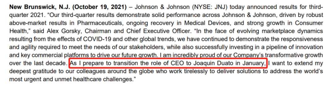 全球换“帅”二次官宣 对于本季度业绩,强生CEO Alex Gorsky总体满意,他表示:"在面对新冠疫情的影响和其他全球趋势所带来的不断变化的市场动态时,强生继续展示了足够的反应能力和灵活性。并为公司在过去十年的转型增长感到无比自豪"。 同时,Gorsky还在财报中再次提及即将卸任的消息。 此前在8月19日,担任强生CEO近10年的Gorsky宣布卸任,将由其长期副手Duato于2022年1月3日接棒。 ▲左:Alex Gorsky;右:Joaquin Duato 但需要注意的是,强生换帅可能对未来业绩产生影响。