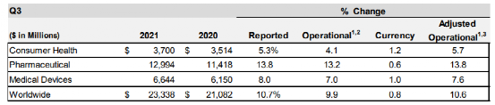消费者健康业务: 2021年Q3,强生消费者健康业务营收37.00亿美元,同比+4.1%;