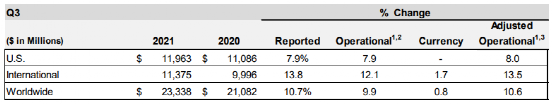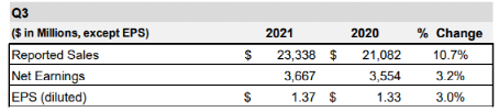 三大板块集体上扬, 医疗器械业务继续回暖 2021年Q3财报显示,强生全球营收为233.38亿美元,同比+10.7%。每股收益1.37美元,增长3.0%。 三大部门销售集体上扬:
