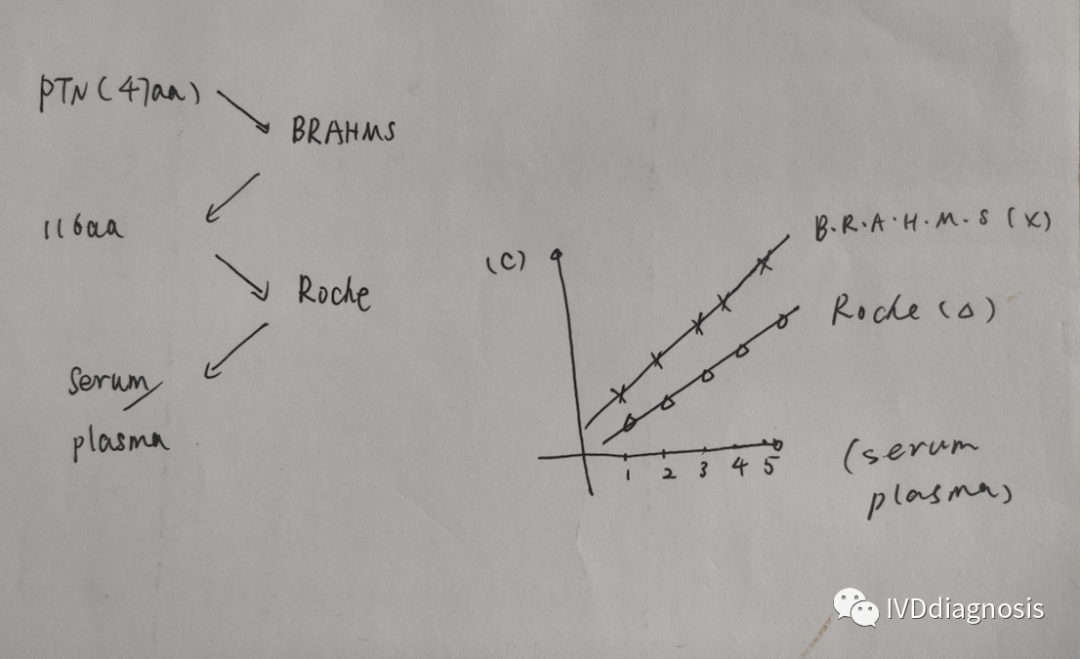工作校准品和产品校准品的选材问题; 选定测量程序的厂家选择问题。 我们知道,出于成本还有来源的考虑,好多项目,我们都是以重组抗原代替人血液中的标志物使用的,这个重组抗原究竟与天然标志物的相似程度有多高,我们不是很清楚。但是有一点是肯定的,就是这个重组抗原越接近于天然标志物,整个溯源链越不容易出问题。假如我们选取的抗原跟血液中的标志物差别有些大,会不会影响这个溯源链呢?这个需要我们去验证一下。我以PCT的溯源举个例子(特殊一些),我们知道PCT的溯源是以BRAHMS为准,他们家的PCT是以47aa的多肽为校准品,并不贴近于天然样本,假如后来的某个厂家想溯源到他们家,为了贴近于天然样本,选取了一个116aa的蛋白作为校准品配制材料去溯源到BRAHMS,这个116aa的蛋白校准出来的自家的试剂跟BRAHMS的试剂的对应性究竟如何,我们需要测试一些血液样本去验证,保证溯源可靠的传递下来。为什么要做这个验证呢,大家知道47aa的比116aa要短很多,如果两家用的抗体配对不在一个频道上,那么不去做临床样本的验证,还真是不好说两家测试结果究竟有多大差异,貌似完整的溯源链却又有点貌合神离的感觉。 比如上图中,假如我们验证出来,两种方法学测试出来的结果有明显的差异,高低水平明显不在一个频道上(某些厂家的标准是线性相关系数r>0.975),那么就得重新选择合适的校准品,比如也用47aa的。小公司很难有市场部,关于立项,一般都是由研发部完成的,这种情况很常见。如果做一个项目,没人能把该项目的来龙去脉能娓娓道来地讲成一个故事,你们的溯源就做不好。 还有就是初创公司针对自己的研发方向,要提前采购对比试剂厂家的仪器,不管是罗贝雅西哪一家,先买过来,不光是做做样子,也要实际做一下溯源,不要总是说自己没钱,等注册甚至售后遇到困难,有时候可不是钱能解决的事情了。最后想说一句,溯源这种事情,如果前期研发都是用重组抗原,而并非你想溯源那家试剂测试出的临床样本,那么你最终再想溯源到他们家,有可能介于抗体对的特异性差别太大,有一定的概率并非能如愿,而且由于这个原因,后期基质效应的评价也会受影响,特异性相差较大的两种方法对于不太明显的基质效应是难以排除的。