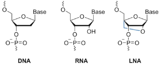 锁核酸(Locked nucleic acid, LNA)是一类经过修饰的高亲和力RNA类似物,其2'-O和4'-C位之间通过亚甲基(下图蓝色部分)连接,限制了呋喃核糖环的灵活性,将其“锁定”为刚性的双环结构,但不影响其遵循Watson-Crick碱基配对原则,同样可与互补的DNA或RNA杂交形成双链体。