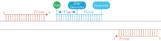 以IDT双淬灭探针为例,其在探针的第9或10位碱基连接上第二个淬灭基团:ZEN™️淬灭剂或TAO™️淬灭剂。