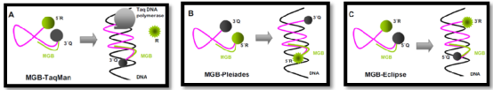 MGB探针包含MGB-TaqMan探针、MGB-Pleiades探针和MGB-Eclipse探针三种类型。TaqMan-MGB探针是在TaqMan探针基础上,于其3’末端再连接上MGB,从而作为一种水解探针,在扩增过程中被Taq酶水解后释放荧光基团产生信号。Pleiades-MGB探针的5’端标记荧光基团并连接上MGB、3’端标记淬灭基团;Eclipse-MGB探针则在其5’端标记淬灭基团并连接上MGB、3’端标记荧光基团。Pleiades-MGB探针和Eclipse-MGB探针均为杂交探针,5’端连接的MGB可阻止其被Taq酶水解,因此该两种探针在与靶标序列杂交后,荧光基团和淬灭基团相对远离,产生荧光信号。