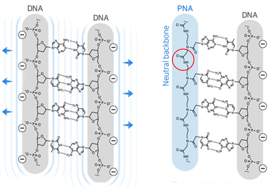 (2)PNA的电中性骨架,可减少其与DNA和RNA链的静电排斥作用,使得PNA与靶标序列具有更高的亲和力;