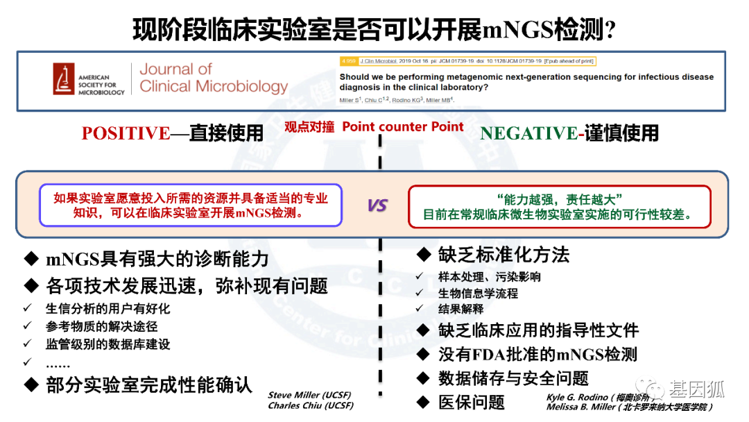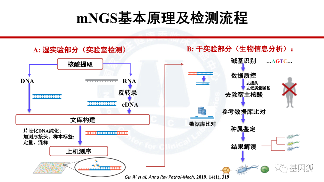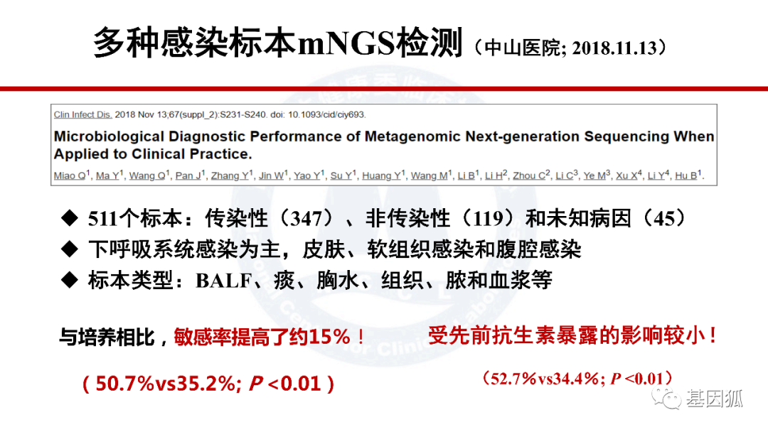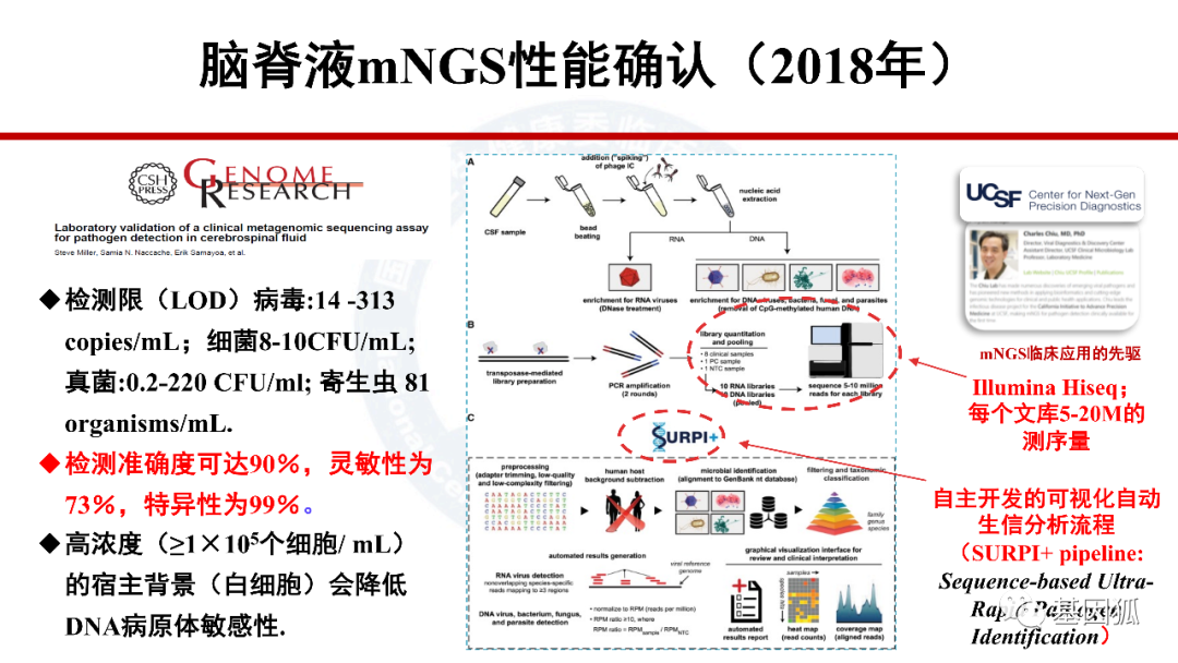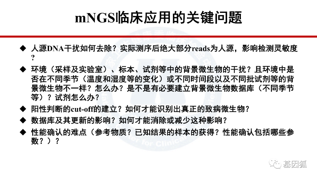 导言 感染性疾病一直是全球范围内的重要公共卫生问题。在其诊疗中,快速、准确地识别病原体至关重要。传统检测方法主要包括形态学检测、培养分离、生化检测、免疫学和核酸检测等,操作简单、检测成本相对较低,同时具有较好的灵敏度和特异度,目前临床仍然广泛应用。然而,传统检测方法耗时较长,加之感染性疾病的病原体种类繁多,仅能针对几种常见病原体进行检测,且检测项目很大程度上依赖临床医师的判断,因此难以识别未知或罕见的病原体。 随着测序技术的飞速发展,新一代高通量测序(NGS,next-generation 2016年,mNGS检测技术正式在中国临床上开始使用,并迅速成为临床病原微生物精准诊断领域「炙手可热」的焦点。但同时也要看到,mNGS不仅给我们提供了许多答案,还给我们提出了很多问题。比如人源DNA的干扰、参考数据库的完善、阳性判断的cut-off值、室内质量的控制、测序检测的费用等问题。 mNGS对于新发或少见病原微生物的检出具有重要价值。但是从成本效益考虑,轻症感染以及使用传统检测方法能够明确诊断的感染,如尿路感染、皮肤软组织感染,不推荐使用mNGS检测。 从技术本身的局限性考虑,人源性细胞较多或背景菌较多的感染标本,如粪便标本,也不太推荐使用mNGS检测。mNGS技术的主要临床适应症如下: 1、重症感染的诊断 2、慢性感染的诊断 慢性感染通常反复发作,较难治愈。由于慢性感染的症状不典型,机体间断性排菌,临床实验室检测困难。 3、疑难复杂感染的诊断 因为mNGS检测技术具有无偏倚性和全覆盖性,对疑难感染病例诊断具有重要作用。 4、免疫缺陷患者感染的诊断 免疫缺陷患者容易发生机会致病菌感染和混合感染,而且感染的病原体复杂多样,诊断困难。而mNGS不受免疫抑制程度的影响,具有良好的诊断潜力。 同时需要注意的是,临床标本中人源细胞占比越高,mNGS检测灵敏度越低。一般而言,人源细胞占比由少到多的顺序是:脑脊液<肺泡灌洗液<血浆<痰液<胸腹水。即使是同一种类型的标本,若来源于不同个体,或来源于同一个体不同取材方法或不同取材时间,人源性细胞的比例都会相差几个数量级。有些标本如粪便、坏死组织等,因背景太杂,在目前的技术背景下不适合做mNGS检测。 mNGS检测技术弥补了传统病原学检测方法的不足,在感染性疾病的诊断中显示出巨大的临床应用价值,已被多个指南和共识推荐。同时,mNGS临床应用仍面临一些问题,需要不断完善,如:标本的采集、核酸提取、基因文库构建、试剂选择、测序数据量和生物信息分析标准化等等。另外,mNGS检测成本较高,外送检测周转时间较长。且mNGS作为一种新型检测方法,阳性结果仅代表临床标本中检出某病原体的核酸片段,无法确定该病原体与感染之间的关系,在有条件的情况下,还应用其他方法或者感染相关的标志物进行相互验证。因此,mNGS尚不宜作为常规检测技术,需要掌握适应症。 随着测序技术的发展以及越来越多的医院临床实验室自主开展mNGS检测,建立规范化检测流程和结果判读标准已成为业内专家的共识。预计在未来几年内,mNGS操作将更加自动化,流程更加标准化,成本亦将显著降低,有望成为感染性疾病病原学诊断的常规检。 那么,mNGS在临床中的实际应用如何?在临床实验室中又面临着怎样的挑战?如何克服这些挑战?今天给大家带来的是国家卫健委临床检验中心李金明老师关于《mNGS的临床应用:目前的关键问题及对策思考》的培训课件,希望对大家有所帮助。 |