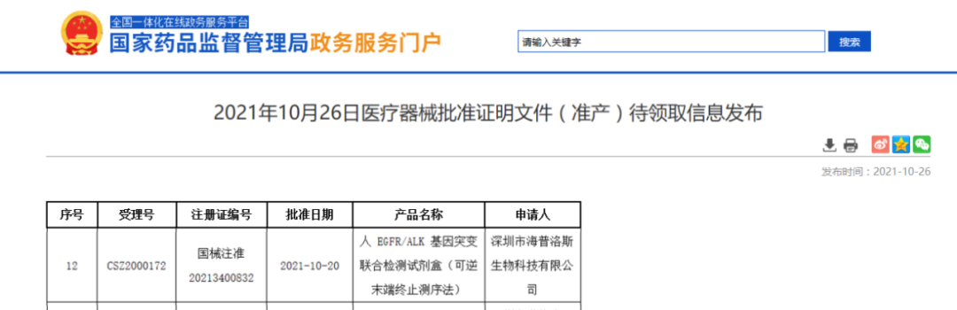 20211026日,由深圳市海普洛斯生物科技有限公司(以下简称“海普洛斯”)自主研发的“人EGFR/ALK基因突变联合检测试剂盒(可逆末端终止测序法)”获得国家药品监督管理局(NMPA)三类医疗器械注册证(国械注准20213400832)。