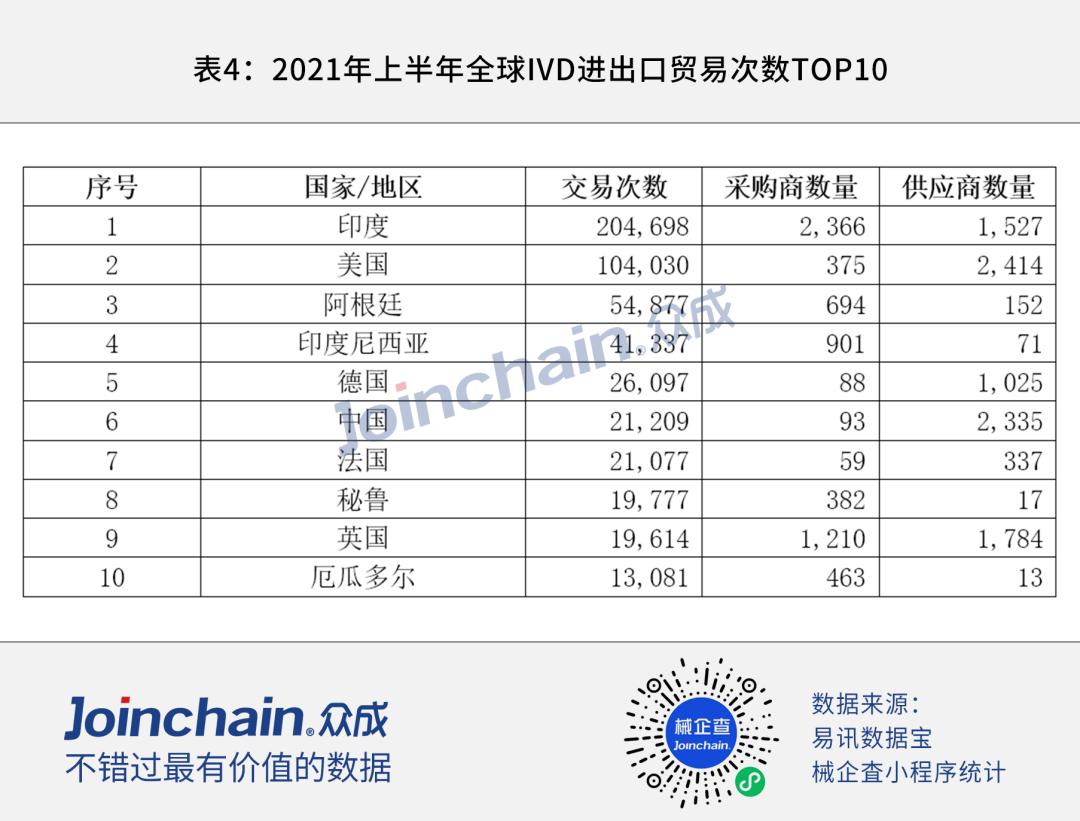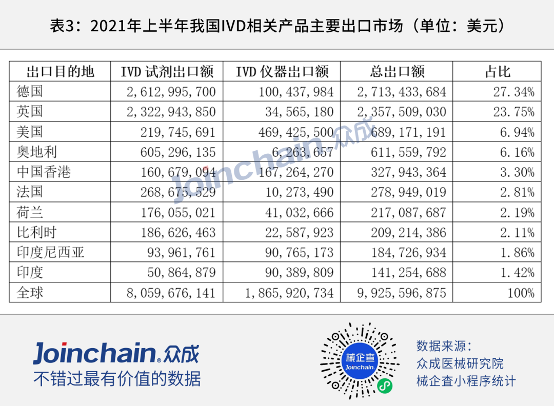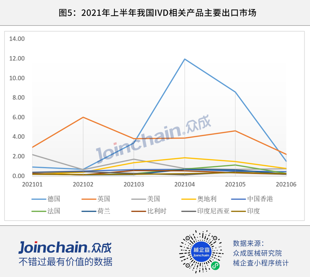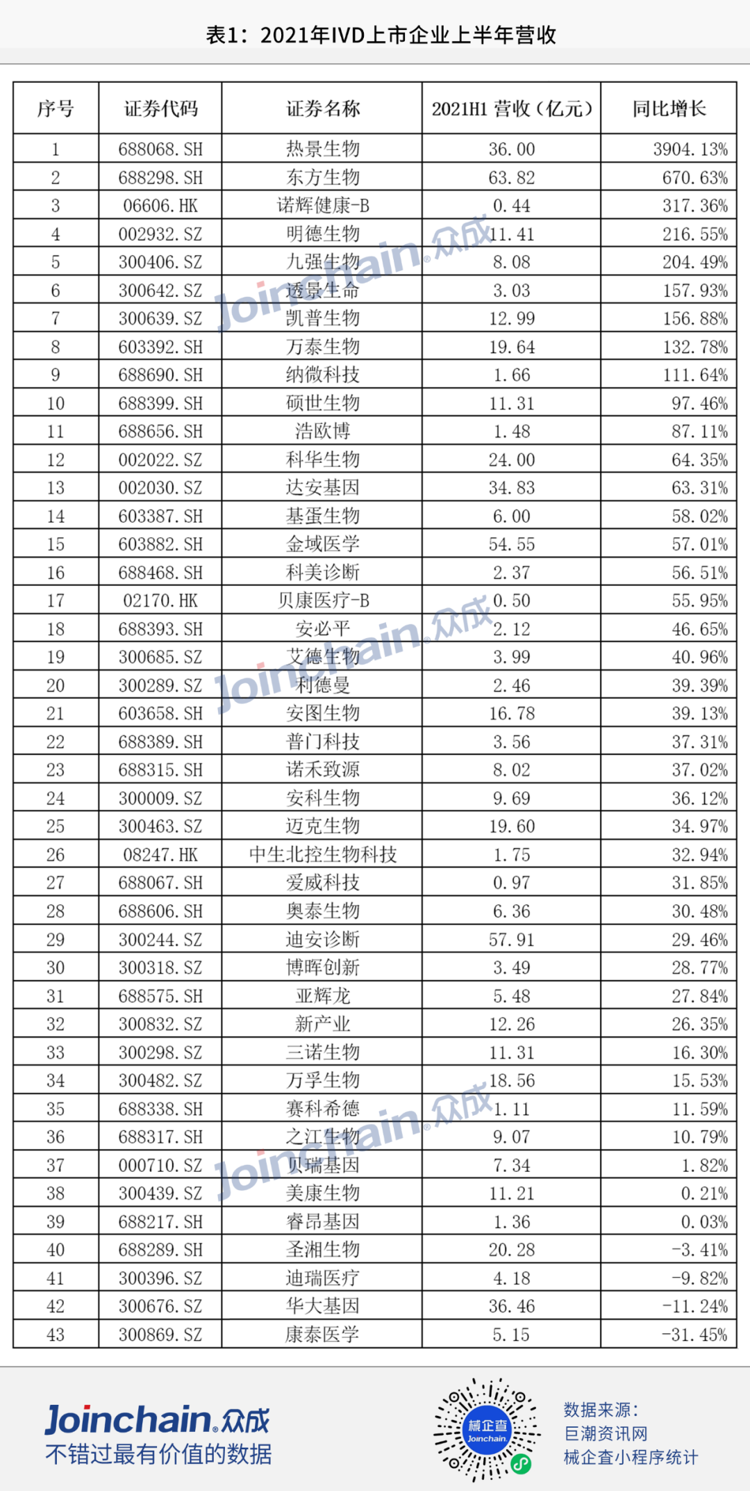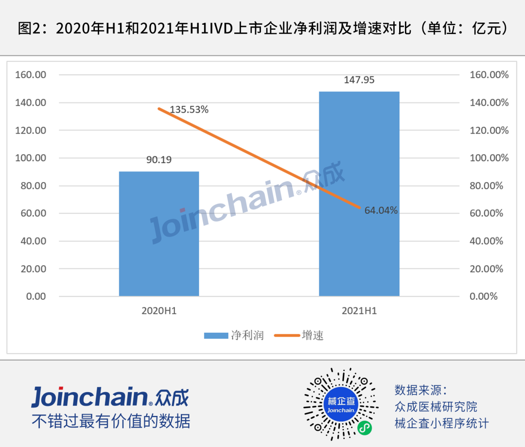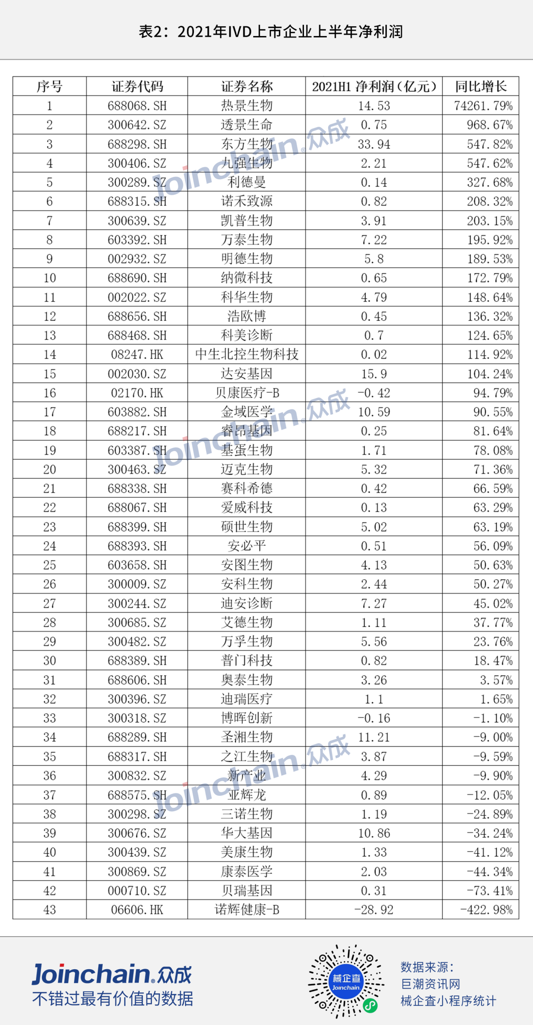 本文通过梳理上半年IVD上市企业业绩和国内IVD企业出口数据,对上半年IVD产业发展现状进行分析。 注:文中43家IVD企业是主营业务为IVD研发、生产、服务以及原料供应的中国(含A股、H股)上市企业 业绩表现:总营收增长,净利润增速回落 在二季度新冠检测需求带动下,2021年上半年IVD上市企业整体营收达572.58亿元,较去年同期的359.30亿元同比增长59.36%,增速连续两年维持在50%以上;从净利润看,2021年上半年净利润达147.95亿元,去年同期为90.19亿元,增速从2020年上半年的135.53%降至64.04%,下降明显。由此看来,因海内外维持严格的疫情防控措施,检测试剂需求热度依然不减,使得IVD企业营收保持稳中有升的态势,但国内部分地区集采政策的实施和IVD企业愈发激烈的竞争格局导至2021年上半年IVD上市企业的净利润增速明显下滑。 1 东方生物营收与净利润创双高,热景生物增幅最高 从2021年上半年营收看,43家IVD上市企业中,有39家企业营收同比为正增长,仅4家企业营收同比下滑。其中,热景生物营收同比增长3904.13%,营收增幅位居首位;营收最高的企业为东方生物(63.82亿元),同比增长670.63%,营收增幅仅次于热景生物。 从2021年上半年IVD上市企业净利润看,有32家IVD上市企业净利润增速同比实现正增长,11家企业业绩同比下滑。净利润同比增长超100%的IVD企业有15家,其中热景生物以74261.79%的同比增长率位居榜首;东方生物在去年上半年1477.45%的高增长下,今年同期依然维持了521.25%增长。此外,凯普生物、万泰生物、明德生物、科华生物、达安基因也均在2020年和2021年连续两年上半年净利润增长超过100%。 2 细分领域:POCT持续高光 从细分领域看,2021年上半年43家IVD上市企业中,分子诊断领域的企业平均营收为11.92亿元,平均净利润为2.02亿元。 免疫诊断领域的企业2021年上半年平均营收为12.92亿元,平均净利润为3.89亿元。免疫诊断领域净利润增幅同比下滑的企业有新产业、亚辉龙。其中,新产业主要系股权激励费用及汇兑损益影响所致;亚辉龙主要系境外新冠疫情持续蔓延导至其产品需求恢复缓慢,境外地区主营业务收入和盈利能力下降,大幅拉低公司的综合毛利率。此外,研发投入的增加也是亚辉龙净利润下降的原因之一。 在生化诊断领域,2021年上半年企业平均营收为8.06亿元,平均净利润为1.63亿元,在各领域中排名最后。 与其他不同的是,POCT领域只凭借东方生物、明德生物、万孚生物、奥泰生物、康泰医学5家企业,2021年上半年实现平均营收21.06亿元,平均净利润为10.12亿元,净利润总额高于其他细分领域。其中,东方生物利润达33.94亿元,占POCT领域企业净利润的67.09%。 3 部分代表企业情况 (1)热景生物:业绩增速同比最高 热景生物2021年上半年净利润同比增加74261.79%,为整个A股市场净利润增幅最高的企业。主要原因在于去年同期公司因经营周期及新冠肺炎疫情导至公司经营业绩较低,与2021年上半年对比基数小;其次是公司的两款新冠病毒抗原检测试剂盒(前鼻腔和唾液)在今年3月获得德国BfArM用于居家自由检测的认证,使公司的外贸订单爆发式增长。热景生物是全球第6家获批进入德国家庭自测市场的企业,但截至6月1日,全球已有73款产品获批进入德国家庭自测市场,竞争环境逐渐激烈,而热景生物在订单峰值过后,不易维持爆发式增长。 (2)东方生物:上半年营收和净利润均最高 东方生物中报业绩预告显示,预计公司上半年营收63.82亿元,净利润33.94亿元,同比增加547.82%,为IVD领域中上半年营收和净利润最高的企业。东方生物分析认为,公司业绩变化的原因在于上半年全球新冠疫情持续深入影响,其新型冠状病毒抗原快速检测试纸(胶体金)符合全球疫情检测产品需求,凭借过硬的技术指标、产品质量、品牌和行业影响力,东方生物深入拓展国际市场,新冠检测试剂销售继续取得重大突破,原有业务保持稳定增长,促使东方生物2021年上半年经营业绩继续呈现大幅度增长。 (3)纳微科技:原材料优势转化为市场优势 纳微科技是一家微球技术领跑全球的IVD原材料企业,上半年净利润为6506万元,同比增长172.79%,其净利润增长的原因在于市场对性能优异、供应稳定、价格合理的国产分离纯化色谱填料和层析介质产品产生的迫切需求。纳微科技依托纳米微球底层制备技术创新优势、齐全的产品种类和丰富的客户基础,实现业绩快速增长。上半年大分子生物药物用亲和层析介质、离子交换层析介质等产品的销售较上年同期有较大幅度增长。纳微科技是目前世界上极少数可以同时大规模生产超纯硅胶、杂化硅胶、聚苯乙烯、聚丙烯酸酯为基质的单分散色谱填料的公司,在微球粒径均一性制备和大规模生产两方面打破外国技术壁垒,实现进口替代。 出口现状:欧洲地区为主要出口市场 2021年上半年,我国IVD相关产品出口额达99.26亿美元。德国、英国、奥地利等欧洲国家为主要出口市场。从出口额占比看,德国和英国分别占我国IVD产品出口的27.34%、23.75%,合计达51.09%。其中,多家国内企业在3月开始获得德国联邦药品和医疗器械研究所(BfArM)的认证,因此,在3-5月向德国出口了大量IVD相关产品。 从2021年上半年全球IVD产品进出口贸易情况看,印度因Delta新冠疫情导至IVD相关产品需求大增,进出口交易次数达20.47万次,采购商数量亦居首位(2366家)。我国的交易次数达21209次,采购商数量为93家,供应商数量为2335家,在IVD产品的进出口