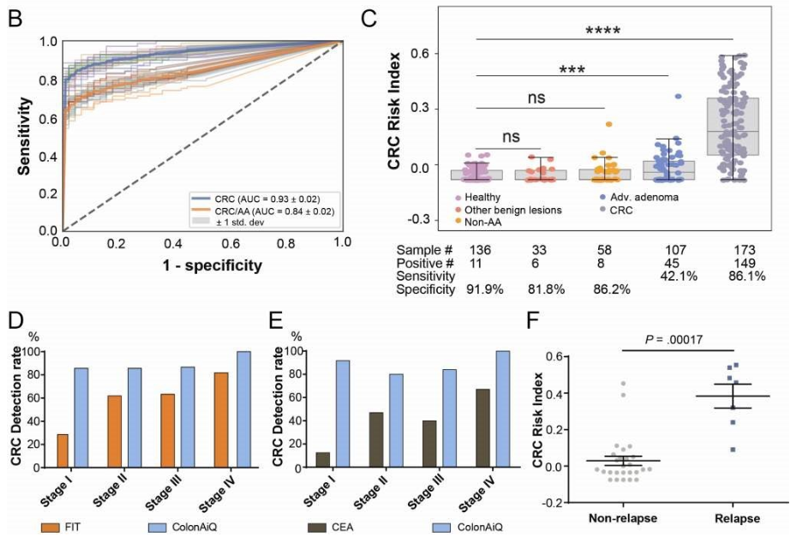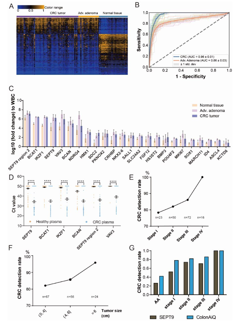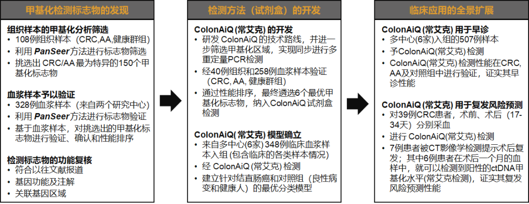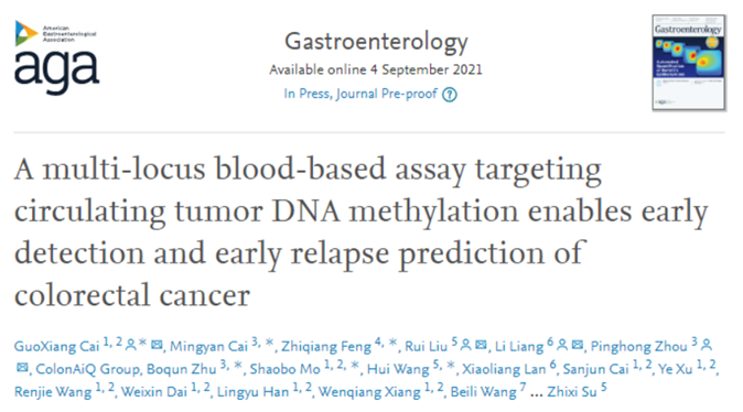 近日,国际胃肠疾病领域顶级期刊《Gastroenterology》(IF 22.7)发表了由上海鹍远生物技术有限公司(以下简称“鹍远生物”)联合复旦大学附属中山医院、复旦大学附属肿瘤医院、广州市第一人民医院、南方医科大学南方医院、四川大学华西医院、大连大学附属新华医院的重磅科研成果:“A multi-locus blood-based assay targeting circulating tumor DNA methylation enables early detection and early relapse prediction of colorectal cancer(血液多基因甲基化检测可实现结直肠癌早筛和复发预测)”。 该研究系国内团队第一次系统展示多基因甲基化检测方法(ColonAiQ,常艾克)从标志物筛选、优化到验证的完整过程。常艾克检测结直肠癌平均AUC:0.93,结直肠癌和进展期腺瘤平均AUC:0.84,结直肠癌(I-IV期)的综合灵敏度为86%(149/173),对照组健康人群的检测特异性为92%(125/136)。这是中国团队首次在全球范围内实现结直肠癌筛查及复发预测技术手段合二为一。常艾克亦是全球第一款具备结直肠癌早期筛查和术后监测复合功能的产品。 据世界卫生组织国际癌症研究机构(IARC)发布的2020年全球最新癌症负担数据显示,世界范围内,结直肠癌已成为第三大常见癌症;2020年全世界有超过193万人被新确诊为结直肠癌,发病率位居所有癌种第三位;超过93万人死于结直肠癌,死亡率位居所有癌种第二位。2020年,中国有超过55万人新患结直肠癌,结直肠癌发病率跃居国内所有癌种第二位,超过28万人死于结直肠癌;多数结直肠癌患者在确诊时已属于中晚期。因而,早筛、早诊对于结直肠癌整体防控尤为重要。就结直肠癌早筛而言,尽管肠镜检查被认为是结直肠癌诊断的金标准,但受制于肠镜的依从性和可及性,更多的患者倾向于基于血液的无创检查方式 [1];另外,准确地预测肿瘤复发,将有助于优化辅助治疗方案;合理安排术后监测随访,及早发现肿瘤复发转移,及时的干预治疗仍有可能使复发转移癌患者重新获得治愈机会,延长生存期。因此,精准的复发预测和动态监测仍是结直肠癌诊治中亟需解决的需求[2]。研究团队基于基因甲基化异常与癌症发生的相关性,探讨了血液样本ctDNA甲基化对结直肠癌及腺瘤的筛查诊断以及预测肿瘤术后复发的性能,结果显示,多基因甲基化有望成为解决临床上结直肠癌的早筛和复发监测问题的新型“肿瘤标志物”。 首先,研究人员对于常艾克标志物进行了严谨的筛选。研究人员在过往PanSeer研究中筛选出 595 个癌症相关基因组区域的基础上[3](图1),进一步通过对组织样本的甲基化分析,筛选出前150个差异甲基化区域 (DMRs)(图2A)。考虑到简化多重qPCR 检测方法在临床上的适用性,研究人员进一步缩小甲基化标志物的范围;最终选择出6种在组织和血浆中具有更高检测能力的标志物,用于多位点血液检测,并命名为常艾克(图2C和2D)。 ▲ 图1.研究设计 接下来的常艾克标志物验证阶段,研究团队在507 个血浆样本中对锁定的常艾克模型进行盲法验证,发现该模型能够检测到173例结直肠癌患者中的 86%,在结肠镜阴性对照(136例)中的特异性为 92%;并且常艾克的敏感性随着结直肠癌的疾病分期进展和肿瘤大小的增加而升高(图2E和2F)。 随后,研究团队对常艾克与其他非侵入性筛查方法进行了比较;相比其他非侵入性筛查方法如粪便隐血试验(FIT)、癌胚抗原(CEA)以及Septin9单位点基因甲基化,常艾克具有显著优越性。在142 名接受常艾克的受试者同样接受了粪便隐血试验 (FIT),常艾克在所有肠癌疾病阶段的表现均优于 FIT(88.3% vs 59.7%),尤其是在 I 期(85.7% vs 28.6%,图 3D)。与 CEA 相比,常艾克同样显著优于CEA,两者对早期 (I/II) 肠癌病例的检出率分别为80-92% 和 17-47%(图3E)。与 Septin9 相比,6种标志物的组合可以比单独的标志物捕获更全面的肿瘤表观遗传异质性(图 2G)。 对于常艾克在结直肠癌预后监测中应用潜力,研究团队也进行了探索。所有结直肠癌患者中,39 名患者在手术切除肿瘤前 1-2 天和术后 17-34 天提供了血样。术前常艾克检测阳性的33例患者中,7例(2例II期,5例III期)在术后42至238天出现肿瘤复发(中位数117天)。研究者观察到复发组和非复发组术后样本的常艾克评分存在显著差异 (p=0.00017)(图 3F)。相应的数据表明常艾克在预测结直肠癌的早期复发方面具有明确的识别能力,后续多中心扩大验证正在进行中。 “ 该研究的通讯作者复旦大学附属中山医院周平红教授表示:结直肠癌的早筛、早诊是结直肠癌防控的重点工作;虽然肠镜是肠癌诊断的“金标准”,但受限于我国肠镜的整体普及率及依从性,目前我国肠癌筛查策略仍然比较“基础”。在这个多中心研究中,我们纳入了相对较多的早癌以及癌前病变样本,因为早癌和癌前病变才是筛查的重点、难点。从目前结果看,常艾克结直肠癌的筛查性能优异,令人满意;而且血液样本相对方便,更有利于提高肠癌临床筛查的依从性。 “ 该研究的第一作者及共同通讯作者复旦大学附属肿瘤医院蔡国响教授表示:目前结直肠癌无创筛查,多采用粪便隐血检测或流行病学量表调查,上海地区也是全国较早开展大规模结直肠癌无创筛查的城市。从本研究结果看,血液样本多基因甲基化检测有望作为结直肠癌筛查策略中的重要补充部分。另外我们通过这个研究还看到了血液样本ctDNA甲基化在肠癌术后复发预测中的潜力,这在其他研究中鲜有报道。目前的结果令人振奋,这会给临床医生在评估结直肠癌