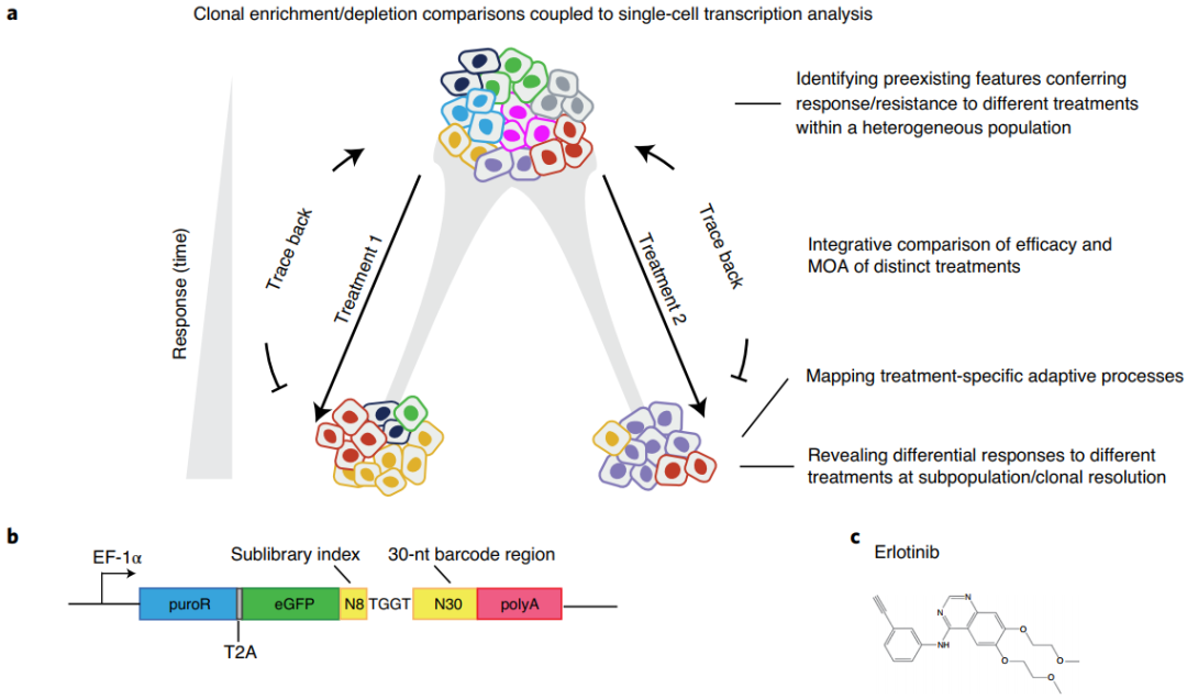 导 读 针对致癌驱动基因突变的靶向治疗为癌症患者提供了显著的临床获益,为精准医疗带来了巨大的希望。但并非所有癌症患者都能产生治疗反应,其他既存的和获得的耐药机制对患者的整体反应和药效持久性提出了巨大的挑战。近年来,靶向蛋白降解这一新的作用机制 (MOA) 引起了人们的广泛关注。与传统的基于占位的靶向抑制不同,异质双功能靶向蛋白降解物能够同时将E3泛素连接酶富集到目标位置,并通过泛素介导的蛋白质水解诱导靶向降解的分子,并被证明在特定情况下优于单独的酶抑制。但目前尚不清楚双作用抑制剂-降解剂是否具有普遍优势。 为了解决上述难题,美国Genentech公司研究团队开发了一个名为TraCe-seq (Tracking differential clonal response by scRNA-seq) 的系统,能够同时跟踪肿瘤起源并比较肿瘤细胞对不同疗法的即时反应,大大加速药物反应机制或者耐药机制的研究。近日,这一研究成果以“Identifying transcriptional programs underlying cancer drug response with TraCe-seq”为题在线发表在Nature Biotechnology。 文章发表在Nature Biotechnology 主要研究内容 为了开发TraCe-seq,研究团队构建了一个与3'端单细胞转录组测序(scRNA-seq)兼容的基于慢病毒的条形码库。每个条形码30个核苷酸组成,具有10万多种不同的组合。此外,研究人员还设计了一个8核苷酸大小的子库索引,以灵活控制总库大小。成功转导后,慢病毒载体将稳定整合到基因组中,使选择性标记、嘌呤霉素抗性和增强型绿色荧光蛋白 (eGFP) 的组成型表达。 图1. TraCe-seq构建和作用模式图。图片来源:Nature Biotechnology 1. TraCe-seq捕获了双重EGFR抑制剂-降解剂的较差活性 EGFR靶向治疗是精准肿瘤治疗的代表性方法之一,因此,研究人员试图使用TraCe-seq来更好地了解EGFR发挥疗效的独特MOAs。虽然靶向EGFR的小分子策略专注于抑制其酶活性,但相对于酶抑制,对EGFR降解的潜在结果知之甚少。为此,研究团队开发了GNE-104,一个由EGFR抑制剂厄洛替尼组成的异源双功能降解物。 为了进行TraCe-seq实验,研究团队随机选取600个携带独特条形码的PC9细胞,将这些细胞扩增12倍,对部分细胞进行了约30倍条形码覆盖率的单细胞转录测序分析,以记录基线转录特征和相对克隆丰度。数据分析结果显示,GNE-104处理在减少TraCe-seq条形码的绝对数量和多样性方面效果较差。此外,虽然在所有处理条件下均观察到类似的MAPK通路抑制,但厄洛替尼和GNE-069诱导的细胞周期阻滞远远大于GNE-104,表明GNE-104处理允许更多的细胞在MAPK通路抑制的情况下持续存在。 图2. 双重EGFR抑制剂-降解剂较差的疗效。图片来源:Nature Biotechnology 2. TraCe-seq揭示了双重EGFR抑制剂-降解剂的不同转录反应和耐药机制 为了进一步了解PC9细胞在克隆水平上对这些处理的不同反应,研究团队将TraCe-seq条形码进行分类,发现TraCe-seq条形码在治疗群体中比未治疗群体的比例高,并被分为三类耐药克隆。特别地,与激酶抑制剂治疗相比,GNE-104治疗导至了一组独特的TraCe-seq条形码的过度表达,这被归类为抗降解的特性。 图3. TraCe-seq揭示了不同类型的耐药克隆。图片来源:Nature Biotechnology 研究人员探索了药物敏感克隆与耐药克隆在基线状态下的基因表达差异。激酶抑制剂耐药克隆与敏感克隆之间的基线基因表达比较结果发现,在治疗前,激酶抑制剂耐药细胞中的VIM和AXL显著上调,证实了TraCe-seq能够成功捕获预期的耐药亚群体和相关的分子标记。抗降解克隆仅表现出AXL的表达升高,没有表现出VIM的上调,表明它们确实在转录上与激酶抑制剂抗性克隆不同。此外,在这些耐降解克隆中,与GNE-104治疗相比,厄洛替尼治疗诱导的内质网途径的蛋白质加工是最丰富和最重要的途径。 图4.基于转录组的不同演化路径的分析。图片来源:Nature Biotechnology 3. 内质网应激程序的缺失增强了EGFR小分子抑制剂的细胞毒性活性 为了进一步验证内质网应激在EGFR激酶抑制剂疗效中的作用,研究人员利用实验抑制剂ISRIB特异性阻断内质网应激下游的前死亡基因的过度激活。在PC9和NCI-H1975细胞中,ISRIB处理确实钝化了由EGFR激酶抑制剂诱导的ATF4、DDIT3和PPP1R15A的激活,并降低了细胞杀伤疗效。相反,在极低的无毒浓度下,添加内质网应激诱导剂则可极大地诱导了内质网应激基因的表达,并增强了降解剂GNE-104在PC9细胞中的细胞毒活性。 结 语 综上所述,TraCe-seq平台能够识别影响不同治疗结果的既有和自适应转录特征。通过追踪暴露于不同的EGFR靶向治疗后有反应和持续存在的细胞,并进行差异基因分析和假时序轨迹比较,研究团队发现了不同MOAs的EGFR靶向药物的细胞机制之间的差异,揭示了EGFR抑制剂反应中一个令人兴奋且此前未被重视的部分:由于抑制结合的EGFR而诱导内质网应激是实现充分疗效的关键。 |