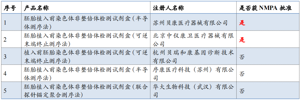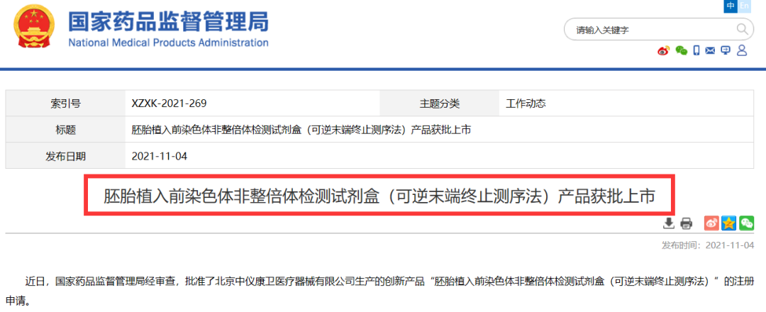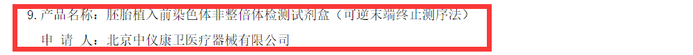 ▲嘉宝仁和“胚胎植入前染色体非整倍体检测试剂盒(可逆末端终止测序法)”正式获得NMPA批准(图片取自:NMPA) 11月4日消息,北京嘉宝仁和医疗科技有限公司(以下简称“嘉宝仁和”)旗下全资子公司——北京中仪康卫医疗器械有限公司生产的创新医疗器械产品“胚胎植入前染色体非整倍体检测试剂盒(可逆末端终止测序法)(商品名:易安顺®)”正式获得NMPA批准,获准上市,注册证号:国械注准20213400868。值得一提的,上述产品于2016年7月底顺利通过创新医疗器械特别审查,成功进入绿色审批通道。 ▲医疗器械特别审批申请查查结果公示(2016年第7号)(图片取自:CMDE) 关于“胚胎植入前染色体非整倍体检测试剂盒(可逆末端终止测序法)” 据悉,该产品是基于新一代的高通量测序平台研制的体外诊断试剂,可对胚胎囊胚期活检细胞中染色体数目异常进行定性检测,用于定性检测试管婴儿过程中体外培养胚胎的囊胚滋养层细胞的脱氧核糖核酸(DNA),通过对胚胎部分细胞的 DNA 进行检测,分析胚胎染色体是否存在非整倍体数量异常,辅助临床医生判断胚胎是否植入。通过胚胎植入前染色体非整倍体检测,有助于减少植入染色体数目异常的胚胎,减少因植入异常胚胎而造成的反复种植失败、反复流产、出生缺陷等。 ▲贝康医疗“胚胎植入前染色体非整倍体检测试剂盒(半导体测序法)”(图片取自:贝康医疗) 值得关注的是,与唯一获NMPA批准上市的(推荐阅读:国内首个 | 贝康医疗PGT-A检测试剂盒获批上市 !)、苏州贝康医疗器械有限公司的“胚胎植入前染色体非整倍体检测试剂盒(半导体测序法)”相比,嘉宝仁和的测序原理不同,胚胎染色体非整倍体算法也不不同。 竞争格局 值得关注的,NMPA已明确将PGT作为III类医疗器械管理。因此,在医疗机构中使用的产品须获得相应注册证,依托设备平台和分析软件也必须获得注册证。 ▲CMDE陆续公示的获得创新医疗器械绿色审批的PGT-A产品(整理:Medactive) 近些年,CMDE陆续公示了获得创新医疗器械绿色审批的PGT-A产品,其中包括:苏州贝康医疗器械有限公司、杭州贝瑞和康基因诊断技术有限公司、北京中仪康卫医疗器械有限公司、序康医疗科技(苏州)有限公司及华大生物科技(武汉)有限公司共计5家开发的试剂盒产品。此外,苏州贝康医疗器械有限公司PGT-M试剂盒也已完成注册检验的产品,并开始进行临床试验,是国内申报进度最快的PGT-M产品。 写在最后 针对PGT产品,从市场层面来看,其临床应用价值越来越明显,市场需求正在不断扩张,已成为辅助生殖最有发展前景的领域。其次,从技术角度分析,随着测序技术成本大幅度降低 根据兴业证劵统计,三代试管婴儿服务的规模(按患者的总支出计,包括注册费、咨询费、检查费、药费及PGT服务费)从2015年的人民币3亿元增加至2019年的人民币25亿元,复合年增长率为70.8%,预期2024年可达到255亿元。但结合贝康医疗(2170.HK)披露的2021年中期数据看,其PGT-A试剂盒销售收入虽同比增长168.0%,但仅有1395万元。 总体来说,挑战与机遇扑面而来,但我们相信未来的PGT产业前景可期。谁能抓住时机,在激荡的市场站稳并扩大份额,我们拭目以待! 来源:NMPA |