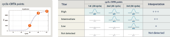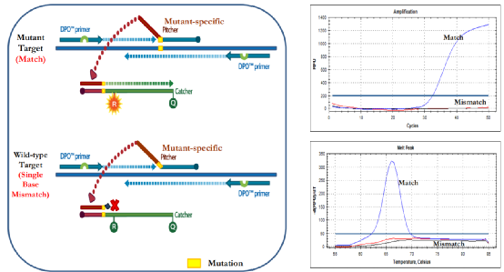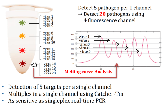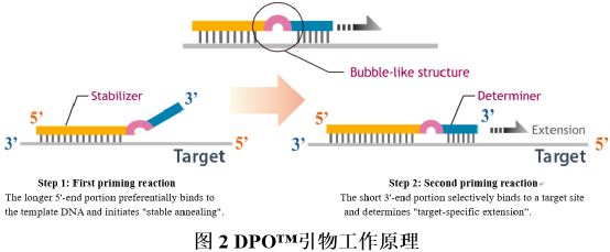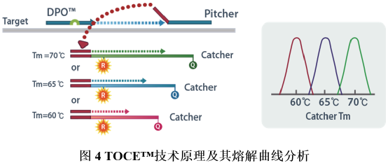 一、DPO™技术 1.原理介绍 Dual Priming Oligonucleotide(DPO™)是一种新型的多重靶标扩增引物设计方法,可提高靶标检测特异性,减少非特异性扩增。该技术可用于“一管多重”检测,也适用于多重实时PCR检测。 DPO™引物结构不同于常规引物,由三部分组成。5’端部分相对较长,是引物退火过程中的稳定序列;3’端部分相对较短,是引物延伸的决定序列;中间插入的多聚脱氧肌苷(Poly-dI linker),将两端的特异性功能序列连接起来。 2.特点分析 (1)DPO™引物的特殊设计,可阻断核酸多重反应中非靶标序列的错误延伸。在PCR过程中,即使DPO™引物的5’端长片段部分,结合至非靶标序列上,也会因为3’端无法互补配对而无法延伸扩增;DPO™引物的3’端由于片段较短,在退火温度中,无法单独结合至非靶标序列上启动扩增。 (2)DPO™引物的结构特点,使其在较宽的退火温度范围内,依然能保持良好的扩增特异性,其允许靶标序列在退火温度差别近10℃的情况下扩增。 (3)DPO™引物的独特结构,可避免形成引物二聚体和复杂的二级结构、防止多重靶标引物间的竞争,因此可实现单个反应中,多靶标扩增时的等效性和同步性。 (4)综合以上特点,DPO™技术特别适用于单管多重核酸检测。 1.原理介绍 Tagging Oligonucleotide Cleavage & Extension(TOCE™)是一种新型的多重实时PCR检测技术,可同时检测5个及以上的靶标基因和基因型。该技术通过设计独特的寡核苷酸,以及特殊的信号生成和熔解温度分析,克服了基于靶标序列的探针法实时PCR技术限制,充分发挥了多重实时PCR技术的检测潜力。采用TOCE™技术可检测和区分单个反应管中的多个靶标,还可通过cyclic-CMTA分析获取定量结果。 TOCE™技术的关键组分:DPO™引物对、Pitchers和Catchers,这三种独特的寡核苷酸,是该技术区别于常规实时荧光多重PCR的要点。其中,DPO™引物对用于靶标区域的特异性扩增;Pitchers是5’端带有标签序列的寡核苷酸,其3’端的特异序列部分可与靶标区域结合,但因3’端封闭而无法延伸;Catcher是双标记的人工合成模板,其3’端含有捕获序列,可与Pitchers 的5’端标签序列互补配对。 (1)TOCE™技术以人工设计的Catcher作为模板进行检测,在熔解曲线分析中具有诸多优势。其一,人工设计的模板Tm值不受靶标序列变异的影响,熔解曲线分析更加稳定可靠;其二,人工设计的模板Tm值更加可控,调整Catcher序列和长度即可设计不同Tm值的Catcher。通过分析每个荧光通道的Tm值,便可区分多重PCR检测靶标。目前Seegene可分析单个荧光通道中的5个靶标,因此对于四色荧光通道,在单管中便可检测20个靶标。 三、MuDT™ 技术 1.原理介绍 Multiple Detection Temperatures (MuDT™)是一种新型的实时PCR分析技术,可用于检测单一荧光通道中,多个靶标各自的Ct值。常规实时荧光PCR,在每个循环扩增中只采集一次荧光,而MuDT™需在每个循环扩增的两个不同温度,采集两次荧光,再利用这两个检测温度的荧光信号变化,结合软件分析,计算出同一荧光通道中两个病原体(如共感染样本)各自的Ct值。该方法无需通过熔解曲线区分不同病原体,通过两步实时荧光采集和软件分析,即可区分同一荧光通道下的两个病原体,因此可使常规实时荧光PCR仪的检测靶标数翻倍。 2.特点分析 (1)MuDT™技术通过改变荧光采集方式,并结合软件分析,提高了单一荧光通道的检测靶标数,无需对常规实时荧光PCR仪器进行硬件升级,最大限度利用现有实时PCR仪。目前Seegene可对同一荧光通道的三个靶标进行区分,这样便可将实时PCR仪的检测靶标数提升至三倍。 (2)通过比较不同检测温度下的荧光强度变化,区分病原体并计算出对应的Ct值,实现了单通道多Ct值的检测方法。基于该技术,可进行多重实时定量检测,也可用于SNP基因分型检测,同一荧光通道即可区分野生型、突变体或杂合体。 (3)Seegene开发的分析软件(Seegene Viewer)可兼容任何PCR仪,可自动分析多重实时PCR数据,对多重靶标的Ct值进行识别和区分。 参考资料 [1] Seegene官网. |