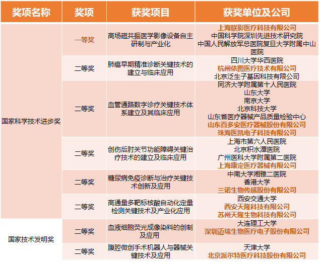 喜大普奔!11月3日是一个值得IVD行业人士欢庆的日子,在这一天,国家科学技术奖励大会召开。 习近平、李克强等党和国家领导人出席大会并为获奖者及其代表颁奖。有多家IVD企业参与的科技创新项目获奖,并上台领奖。 可以说,国家科学技术进步奖是中国科技领域最高的荣誉,是每个研发人员最想获得的鼓励。也是每个IVD企业能在研发上持续投入的最好的肯定。空白正在一个一个的被填补,技术垄断正在一个一个的被打破,科技创新,国之利器! 接下来,请大家跟随小编,领略一下2020年度国家科学技术奖的整体情况吧! 01 奖项总体情况 ➣ 2020年度国家科学技术奖共评选出264个项目、10名科技专家和1个国际组织。 ➣ 国家最高科学技术奖2人。 ➣ 国家自然科学奖46项,其中一等奖2项、二等奖44项。 ➣ 国家技术发明奖61项,其中一等奖3项、二等奖58项。 ➣ 国家科学技术进步奖157项,其中特等奖2项、一等奖18项、二等奖137项。 02 获奖企业情况预览 IVD企业获奖名单 深圳迈瑞公司参与的“血液细胞荧光成像染料的创制及应用”项目,荣获国家技术发明奖“二等奖”。 杭州依图医疗技术有限公司、北京泛生子基因科技有限公司参与的“肺癌早期精准诊断关键技术的建立与临床应用”项目,三诺生物传感股份有限公司参与的“糖尿病免疫诊断与治疗关键技术创新及应用”项目,西安天隆科技有限公司,苏州天隆生物科技有限公司参与的“高通量多靶标核酸自动化定量检测关键技术及产业化应用”,获得国家科学技术进步奖“二等奖”! 医疗器械企业获奖名单 上海联影医疗科技有限公司参与的“高场磁共振医学影像设备自主研制与产业化”项目,获得国家科学技术进步奖“一等奖”。 北京派尔特医疗科技股份有限公司参与的“腹腔微创手术机器人与器械关键技术及应用”项目获得国家技术发明奖“二等奖”。 山东百多安医疗器械股份有限公司,珠海医凯电子科技有限公司参与的“血管通路数字诊疗关键技术体系建立及其临床应用”,上海康定医疗器械有限公司参与的“创伤后肘关节功能障碍关键治疗技术的建立及临床应用” 也获得国家科学技术进步奖“二等奖”! 综上,本次国家科学技术进步颁奖大会中,有11家医疗公司获奖,其中以迈瑞医疗为首的IVD企业合计6家,以上海联影为首的医疗器械公司合计5家。 03 千磨万击还坚劲,任尔东西南北风 用总理的话说,基础研究的根扎得越深,科技创新之树就越枝繁叶茂。新征程赋予科技事业新使命,呼唤科技工作者新作为。 祝愿所有的IVD企业都能持续深耕细作,做大做强,成为国家科技创新的中坚力量! |