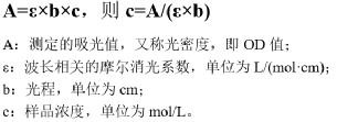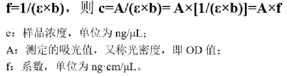 研究者根据测试确定了不同核酸类型的系数f,其中dsDNA系数为50ng·cm/μL、ssDNA系数为33ng·cm/μL、RNA系数为40ng·cm/μL。将光程b归一化为1cm后,则吸光值A为1时,相当于dsDNA浓度约为50ng/μL、或ssDNA浓度约为33ng/μL、或RNA浓度约为40ng/μL。由此,可根据吸光度估算核酸的浓度,这种计算在许多仪器中可自动进行。