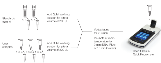 其检测过程需使用酶标仪或荧光计,以ThermoFisher的Qubit为例,测试过程中,需先使用标准品生成标准曲线,再对样本进行定量。大致过程为:将标准品和样本分别与检测工作液在专用反应管中混合后,室温孵育2min,再置于荧光计上读取数据。
