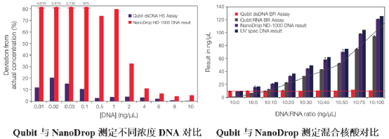 ③相比NanoDrop,灵敏度和特异性均提高,可检测到pg级别。其中高敏dsDNA定量范围为10pg/μL~100ng/μL、ssDNA定量范围为50pg/μL~200ng/μL、RNA定量范围为250pg/μL~100 ng/μL;通过染料特异性结合,对dsDNA、ssDNA和RNA进行选择性区分测量,准确检测靶核酸分子浓度。从Qubit与NanoDrop的对比数据看,NanoDrop测量低浓度样本时,浓度偏差较大;在含有DNA和RNA的样品中,NanoDrop仅能测到总核酸量,而Qubit则可选择性区分定量DNA和RNA。