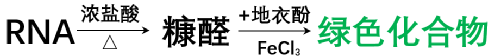 ①RNA浓度测定:RNA与浓盐酸在共热时,RNA中的核糖可转变为糠醛,并与3,5-二羟基甲苯(地衣酚)在三氯化铁催化下,反应生成鲜绿色化合物,该产物在670nm处具有最大吸收值。该方法测定的RNA浓度在20~200ng/μL范围内,浓度与光吸收值成正比。