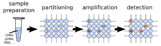 (1)原理:数字PCR(dPCR)是一种不依赖Ct值、无需标准曲线的绝对定量方法,该方法将标准的PCR反应体系分隔在许多微小的反应单元中,并通过有限稀释使得靶核酸分子在反应单元中的数量平均为1个或0个,对应反应单元的检测信号为“有”或“无”,由此可直接计算靶核酸的数量。而在实际测试时,一个有信号的反应单元可能包含1个以上的靶核酸,因此需结合泊松分布原理进行统计,确定靶核酸拷贝数。