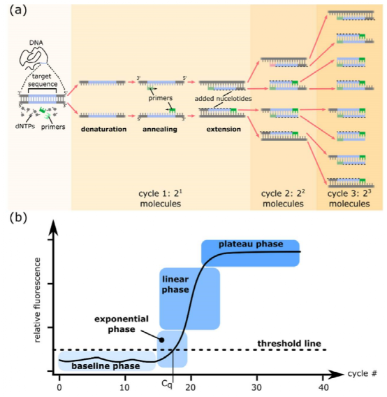 (1)原理:通过在PCR反应体系中加入荧光染料或荧光探针,使得核酸扩增过程呈现出实时的荧光信号变化,且其扩增指数期对应的Ct值与起始模板浓度的对数存在线性反比关系,由此,结合已知浓度标准品建立的标准曲线,可对核酸进行定量。该方法是基于特异性的引物和探针来检测的,可用于确定靶核酸的拷贝数。