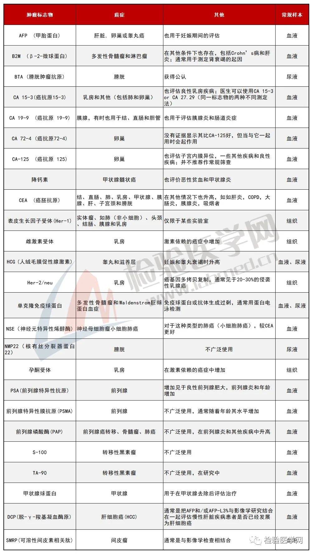 肿瘤标志物是机体适应肿瘤的生长而产生的或肿瘤组织自身所产生的蛋白,可在血液、尿液或者组织标本中检测到。某些肿瘤标志物有特异性,而其他的标志物可在不同类型的癌症中出现。许多已知的肿瘤标志物也可见于未患肿瘤个体中。无庸置疑,肿瘤标志物本身对癌症而言都是非诊断性的。 以下表格统计包含国内3000多家各等级医院检验科及独立医学实验室的检验、仪器试剂使用情况,以下数据截至2021年11月1日。 国内外指南已明确的肿瘤标志物临床价值包括以下3方面。 1、辅助诊断 “辅助”即不具有决定性作用。由于前述提到的检测手段灵敏性、肿瘤发展的生物学特性等原因,肿瘤标志物检测结果存在假阳性和假阴性的问题,即便是目前国际上公认的可用于肿瘤早期筛查的AFP、CEA、CA125、PSA这四个标志物,其对早期肿瘤的检出率也不到30%。 2、疗效监测 一般情况下,恶性肿瘤治疗后,患者肿瘤标志物浓度变化与疗效之间有一定相关性。如果肿瘤标志物浓度下降到参考区间,提示肿瘤治疗有效;如果浓度下降但仍保持在参考区间以上,提示有肿瘤残留和(或)肿瘤转移。 3、预后随访 对于已接受肿瘤切除术及其他治疗的患者,出院后定期监测肿瘤标志物水平,可以了解肿瘤是否复发。如果肿瘤标志物浓度下降到参考区间一段时间后又重新升高,提示肿瘤复发或转移。 其中,学术界普遍认为,肿瘤标志物的主要临床意义在于疗效监测和预后随访。因此,不提倡对无症状人群进行肿瘤标志物筛查。但对特定肿瘤的高危人群或高发地区,选择有针对性的标志物进行筛查和动态观察,是可行也是有效的。如对慢性乙肝和丙肝患者,定期检测AFP筛查肝癌,在鼻咽癌高发区可通过EB病毒衣壳抗原(VCA)/IgA检测筛查鼻咽癌。 此外,在临床应用过程中,由于肿瘤标志物在恶性肿瘤发生的不同阶段,其检测敏感性有所不同,因此要结合影像学检查综合分析。 1、灰区判读 通常有肿瘤伴随的患者,其相关肿瘤标志物水平都远高于临界值。如果测值在临界值附近(即“灰区”),患者又没有相关症状,则患肿瘤的可能性较小,但建议定期观察。此外,灰区测值也可能是由检测误差所致。 2、影响因素 一些良性疾病,包括炎症、良性肿瘤(肺结核、肝硬化、结直肠多发息肉、胰腺炎、肾衰等)会导至肿瘤标志物异常。布洛芬、类固醇、奥美拉唑等药物以及某些保健品和中药也会导至部分人群肿瘤标志物异常。例如消化道肿瘤标志物CA724是一种糖类抗原,如果患者服用了灵芝等含有多糖物质的保健品,其血清CA724浓度会大幅升高,停药后即可降至正常。但是由于目前只有少数案例,尚无大数据证实是哪类保健品或中药在“从中作梗”。 此外,女性月经期会导至CA125升高,外科肛诊检查可引起PSA一过性升高,近期注射过疫苗等生物制剂也会引起相关肿瘤标志物出现假阳性。肝脏疾病,尤其肝功肾功能不全,会导至一些肿瘤标志物升高。因此建议使用联合检测,尢其要配合影像学综合判断,合理解读检测结果。