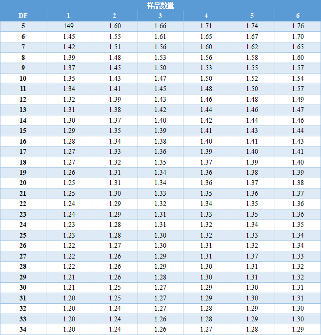 2.6、用户获得的不精密度的评价 2.6.1、用户获得的不精密度与厂家的声明进行比较 在完成精密度验证实验每个样品的重复性和实验室内不精密度计算后,用户应检查验证的不精密度是否与厂家声明的一致。 如果实际获得的不精密度均值约等于厂家声明的不精密度,那么由于单独的机会性,观察到的不精密度将会比厂家声明的不精密度大50%。 为降低因单独机会性造成的验证厂家精密度声明的失败率,可计算厂家声明的上限证值(UVL)。 当厂家精密度声明正确时,UVL表示从相同样本量和相同实验设计方案的用户精密度实验中获得的不精密度估计的95%上限。 用户宁可使用UVL也不单独使用厂家声明作为验证实验是否通过的判断标准,可以避免由于随机性引起的不恰当的验证失败,使验证试验成功率至少提高5%。 对于某给定样品,只有在用户重复性估计值小于或等于厂家声明值(若失败,必须小于或等于厂家声明的相关UVL)时,才能说用户验证的某浓度样品重复性与厂家声明一致。 由于UVL经常大于相关的声明,用户估计值有时大于厂家声明的30%,仍然算通过。 用户可以按下列两个步骤有效地进行一致性检验: 1) 第一步,将所有浓度样品的重复性和实验室内不精密度的估计值直接与相对应的厂家声明进行比较; 2) 第二步,任何估计值如果超出了厂家声明值,计算相关的UVL,并将估计值与UVL进行比较。 通过简单的检查一般都能判断出样品在某测量浓度的一致性,不必正式计算厂家声明UVL。 2.6.2、识别厂家的精密度声明 本文假设厂家精密度声明是具有代表性的,该声明具有典型性或可以反映检测系统的平均性能,这些声明通常总结在厂家的PI表内。 PI表是指通过实验计算得到的检测系统检测一定浓度样品的重复性和实验室内不精密度,通常用平均值、s和/或CV表示,并列于PI表内。 PI表也可能包含关于重复性和/或实验室内不精密度的精密度特征曲线,可显示CV(或s)如何随着样品浓度的变化而变化。 为验证用户不精密度估计值是否与厂家声明一致,有必要清楚精密度验证实中样品的相关声明。 用户观察到的平均检测浓度不一定完全符合PI表内的浓度,有时厂家PI表中可能会选择接近平均值的浓度样品CV作为该浓度的精密度声明。 用户可从PI表内取该水平浓度相邻的2或3个平均值,比如通过插人或选平均值来确定平均值处的精密度声明更合适。 2.6.3、进行比较 如果用户的不精密度没有超出厂家声明,说明一致性符合。 如果用户的估计值超出了厂家声明,则需要补充一致性检验,并将得到的估计值与声明的UVL比较。 可根据下列三个步骤计算UVL: 1) 计算待考察的精密度估计的自由度df(dfR是重复性的自由度,dfWL是实验室内不精密度的自由度)。 2) 从表7查得UVL的F因子。 3) 利用UVL的F因子计算UVL和厂家的声明。将用户的不精密度与UVL进行比较。 对于重复性比较,计算重复性的自由度dfR: dfR=N-k (12) 式中, N为结果的总数目; k为检测批次的数目。 对于实验室内不精密度比较,首先计算声明的比率ρ,如公式13所示: ρ是用厂家的实验室内精密度声明除以厂家的重复性声明,可以用s表示,也可以用CV表示。然后查表6得到大概的自由度,dfWL。 表6 | 厂家声明的比率对应的自由度dfWL,第五至第七批,每批重复5次 表7 | 实验中样品数量从1~6时对应的UVL F因子 2.7、结果解释 完成所有数据分析和一致性检验后,用户可得到以下结果: 1) 实验中每个样品的重复性和实验室内不精密度的估计值; 2) 不精密度估计值的一致性检验结果(通过或失败)。 用户还应检查实验中所使用的样品浓度有没有覆盖厂家精密度确认实验的范围。如果所有浓度样品精密度结果都在验证范围内,则用户精密度与厂家声明一致。 12 刘博 由于样品数量有限,这些统计结果有可能接受了错误的通过和错误的失败。 通过与厂家声明进行比较,一般会有以下有几种情况: a) 情况1: