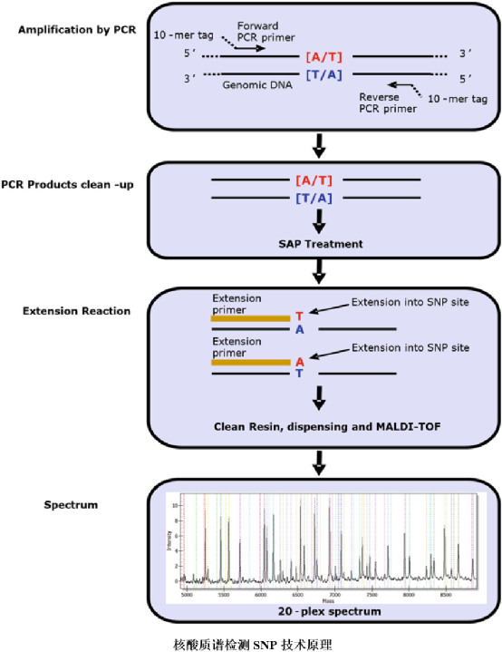| 质谱技术自20世纪初诞生以来,已有100多年历史,期间有十多位研究者因在质谱的发明发展和研究应用上做出重要贡献而获得了诺贝尔奖。在其不断推陈出新的过程中,质谱技术的应用范围也逐渐拓宽,成为了重要的科学研究工具之一。而质谱技术对生物大分子的研究,则为其在生物医学领域中的应用埋下了伏笔,其中核酸质谱便是当前临床医学中极具应用潜力的工具之一。质谱技术(mass spectrometry)是分离和检测带电粒子质荷比的分析技术,相当于一台特殊天平,用于分类称量离子质量。以其高特异性、高灵敏度、高耐受性、分析快速与检测信息丰富的特点,越来越受到临床研究和诊断的关注。质谱技术早期在临床实验室的应用,主要是气相色谱质谱(Gas Chromatography MassSpectrometry, GC-MS)对军事药物使用的监测。但GC-MS主要适用于挥发性和热稳定性化合物,样品制备程序复杂,检测通量低,这限制了其在临床中的进一步应用。直至快原子轰击、电喷雾和辅助激光解析等“软电离”技术的发展,产生了诸如液相色谱-串联质谱 (liquid chromatography-tandem mass spectrometry, LC-MS/MS)、电感耦合等离子体质谱技术(inductively coupled plasma mass spectrometry, ICP-MS)和基质辅助激光解吸飞行时间质谱(matrix-assisted laser desorption/ionization time-of-flight mass spectrometry, MALDI-TOF MS)等新方法后,才使得质谱技术对蛋白质、酶、核酸等生物大分子的检测成为可能,也大大拓宽了其在医学检验领域的应用范围。其中,基质辅助激光解吸电离技术(matrix-assisted laser desorption/ionization, MALDI)据称是在一次误用化学试剂的操作中发展起来的,其发现者田中耕一也在2002年获得了诺贝尔化学奖(同步期待10月4日下午即将揭晓的2021年第一个诺贝尔奖项——诺贝尔生理学或医学奖,不知花落谁家)。该技术通过引入基质分子,使待测分子不产生碎片,解决了非挥发性和热不稳定性生物大分子解吸离子化的问题,实现了生物大分子的软离子化,便捷地将生物样本引入质谱系统,再结合飞行时间质量分析器(time-of-flight, TOF),实现了生物大分子(核酸、蛋白质和有机物等)的快速分析,产生了目前临床应用最为广泛的微生物鉴定、核酸分析等方法。MassARRAY®是美国Agena Bioscience(原Sequenom Bioscience)公司基于MALDI-TOF原理建立的核酸质谱分析系统,其基本原理是将预处理后的PCR扩增产物,通过仪器点样至带有基质的芯片上,使其与基质结合形成共结晶;再用激光照射复合物晶体,经辐射的基质分子吸收并积蓄能量后迅速升温,使得晶体升华进入气相状态,核酸分子也随之解吸并转变为亚稳态离子(多为单电荷离子);这些单正电荷离子可在加速电场中获得动能,并在飞过自由漂移区后向检测器飞行,且离子质量越小,飞行速度越快,也就更早到达检测器,不同分子量的核酸分子因到达检测器的时间不同而得到检测。该系统整合了PCR技术的高灵敏度、芯片技术的高通量、质谱技术的高精确度,以及生物信息的智能化分析功能,为临床研究与应用提供了另一个技术平台。核酸质谱是一把高精度的天平,可区分单个碱基的质量差异(G>A>T>C),而核酸质量又与碱基组成与长度有关,因此在PCR预处理过程中,使用不同方法形成碱基质量有差异的质谱待测物,则可实现核酸分子的不同检测目的。如通过单碱基延伸和分子切割的两种生物化学技术,使得核酸质谱可用于SNP检测和甲基化分析。单核苷酸多态性(SNP)是指在基因组水平上由单个核苷酸的变异引起的DNA序列多态性,其在遗传疾病的诊断和筛查以及用药种类及剂量指导等方面有着极其重要的作用。MassARRAY®可通过精确区分4种碱基的分子量差异,对SNP进行检测。其在PCR过程中采用了两轮扩增,从而生成了可用于质谱分析的单碱基延伸产物,详细技术原理如下:①在跨越SNP位点的上下游区域设计一对引物,该对引物的5’端带有10 mer tag(ACGTTGGATG),其目的是使第一轮PCR引物≥30bp(质谱图峰检测的范围是4500~9000 Da之间,而碱基平均分子量为300 Da,因此对应的核苷酸检测范围为13~30bp,这样第一轮PCR引物即使未能被后面的SAP完全消化,也不会出现在质谱图中)。该过程也可针对不同SNP位点设计成多重PCR,目前单个反应可达10~60重检测。由此扩增出含有SNP位点的第一轮PCR产物,加入虾碱性磷酸酶(Shrimp Alkaline Phosphatase, SAP)去除剩余的dNTP后,为第二轮PCR做准备。②针对每个靶点,在紧挨其SNP位点处设计一条单碱基延伸引物,并在体系中加入双脱氧核苷三磷酸(ddNTP),以第一轮PCR产物作为模板进行延伸,使得延伸引物在SNP位点处延伸一个碱基后即终止,由此每个SNP的等位基因延伸产物仅有末端一个碱基的差异。③将第二轮PCR产物与树脂混合,通过离子交换去除液体中吸附于DNA片段上的离子,再在系统上进行质谱分析获得图谱,根据延伸产物分子量的不同,于对应各自的分子量位置查看检测峰图。在人类基因组中,DNA甲基化一般发生在CpG位点(胞嘧啶-磷酸-鸟嘌呤位点),其胞嘧啶会在DNA甲基化转移酶的作用下与甲基基团结合转化为5-甲基胞嘧啶,作为一种重要的表观遗传学标记,在调控基因表达、维持染色质结构以及胚胎发育等生物学过程中发挥着重大作用。MassARRAY®可通过对前期酶处理后的产物分析,根据碱基G和碱基A之间16 Da的分子量差异区分出甲基化和未甲基化的C,并利用各自的峰面积计算出该CpG位点甲基化比例,从而估算整个检测片段内的平均甲基