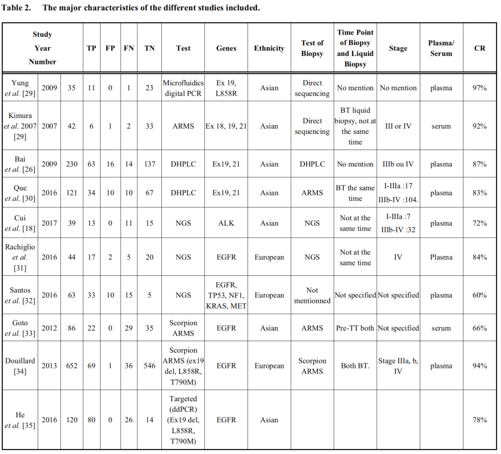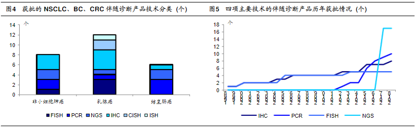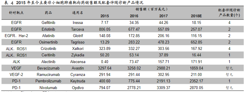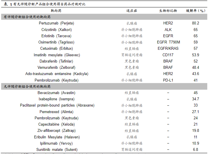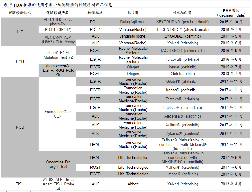 在伴随诊断行业发展过程中,主流的伴随诊断技术随时间推移产生了更新,NGS测序技术的进步推动了伴随诊断行业发展。我们分析了伴随诊断应用最广泛的三大癌种,即非小细胞肺癌、乳腺癌、结直肠癌的伴随诊断产品。结果显示,2010年前,获批的三大癌种的伴随诊断产品主要采用IHC与FISH技术,2010年后,基于PCR的伴随诊断与靶向药的组合开始获批,基于IHC与FISH的伴随诊断产品增长开始放慢。2017年起,大量基于NGS的伴随诊断与靶向药组合获批,开启新一轮的增长(图4、图5)。 靶向治疗与伴随诊断是实现精准医疗的两大重要工具。伴随诊断是与特定药物的临床应用相关联的一类体外诊断技术,主要通过检测对某种特定药物临床反应具有相关性的基因、蛋白等生物标志物的水平或特征,在不同类型的疾病人群中筛选出最佳用药人群,有针对性地进行个体化医疗。伴随诊断与靶向药结合使用能有效提高靶向药的治疗效果(表1)。 2018年一项液体活检荟萃研究:纳入839例样本,80%的患者进行了活检,30%的病例活检不足以进行分子诊断。据报道,液体活检(LB)可能是组织样本的替代品,自2014年以来已被引入到患者的管理方案中。研究目的是强调液体活检与组织活检在评估非小细胞癌分子谱方面的诊断价值(图6、表2)。 这项荟萃分析表明,cfDNA检测分子突变在与组织相关的诊断中具有足够的准确性。LB的高特异性和中等敏感性突出了其作为筛查试验的价值。 液体活检,是一种无创,NCCN批准,高潜的伴随诊断技术。目前,FDA共批准了35种伴随诊断产品。目前,伴随诊断最主要的应用领域仍是在肿瘤治疗方面。35种获批的伴随诊断产品中,以针对乳腺癌、非小细胞肺癌、结直肠癌的产品数量最多,分别达到了12项、8项与6项。8项肺癌产品共涵盖了四个技术领域,包括3项IHC产品、2项PCR产品、2项NGS产品与1项FISH产品,检测靶点包括PD-L1、ALK、EGFR、BRAF和ROS1(表3)。 由于伴随诊断产品需与靶向药配套使用,伴随诊断产品与其对应的靶向药之间有较强的联动关系,理清目前主要癌种靶向药的市场情况,对分析未来伴随诊断产品的发展方向有一定的指导作用。就伴随诊断产品与非小细胞肺癌靶向药的联动关系上看,多数靶向药都有多项配套伴随诊断产品。统计的11项药品中,只有作用于VEGF、VEGF-2的贝伐珠单抗、雷莫芦单抗以及作用于PD-1的纳武单抗暂时没有对应的伴随诊断(表4)。 由此,我们认为在国际市场,尤其是美国市场上,伴随诊断与靶向药的组合已发展成一个较为完善的体系。这一体系的形成也得益于FDA 2011年开始起草,2014年正式发布的伴随诊断设备指南。该指南对医疗产品与相应的伴随诊断提出了要求,总结如下:首先,指南规定对于有必要辅以伴随诊断的医疗产品,伴随诊断设备通常需要与医疗产品同步研发,以保证当医疗产品被批准时,伴随诊断可以同时上线。在新型医疗产品获批前,FDA会决定对应的伴随诊断设备是否满足安全高效或符合其效用的标准。如若伴随诊断设备未达标,FDA将对该新型医疗产品不予批准。 在某些特定情境下,FDA会批准通过伴随诊断暂未过审的医疗产品。这一情形是建立在是FDA认为相应的伴随诊断设备会紧随医疗产品的批准而通过审核。具体而言,先于伴随诊断获批的医疗产品主要适用于以下两种情况: