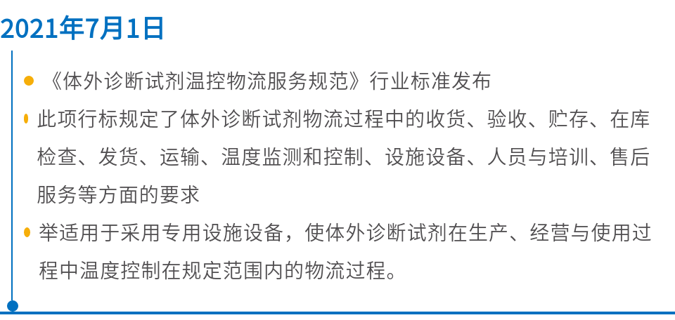 行业标准发布 /1 07 2021年7月1日,《体外诊断试剂温控物流服务规范》行业标准发布,规定了体外诊断试剂温控物流服务的基本要求、人员与培训、设施设备、物流作业、温度监测和控制、追溯与应用和应急处理,旨在增补、完善体外诊断试剂全程温控物流管理,使产品在流通质量中始终保持在温控范围内,引领行业健康有序发展。 体外诊断试剂是实验室进行检测时所用到的试剂类产品,主要包括诊断试剂、校准材料和控制材料等。体外诊断试剂是一种特殊的药品和医疗器械,但是,其物流需求不完全等同于药品和医疗器械。 体外诊断试剂多数都含有酶、抗原或抗体等生物活性物质,在高温情况下极易失活。因此,体外诊断试剂的运输保存都需要严格控制温度,通常要求在2~8℃或-20℃等温度下运输,保证全程冷链(所谓冷链是指体外诊断试剂从生产到使用全过程的相关环节,为保证其在贮存、运输和使用过程中,都能保持在规定的冷藏温度条件下而装备的一系列设备及其转运过程的总称)。为保证试剂质量的稳定性,从生产到使用前的每一个环节都需要符合冷链管理要求,做好冷链运输才能保证体外诊断试剂的准确性和有效性。 体外诊断(IVD)试剂,堪称“医生的眼睛”。它贯穿于医学诊疗的全过程,其质量安全与防病治病息息相关,是人们直接的利益问题。近年来,随着医疗器械法律法规的不断完善,尤其是国家医改政策的相继出台,对体外诊断试剂冷链监管要求日趋严格。 根据这一系列的法律法规和政策,对体外诊断试剂的冷链管理进行了规范化的要求,为试剂质量的稳定性和有效性提供了保障。 目前我国在医疗冷链领域根基仍较为薄弱,但随着国家利好政策的出台落实,以及后疫情时代下疫苗运输、下游样本库以及医院需求的日益增长,医疗冷链物流行业前景被看好。国内的大部分企业以复合型解决方案为主提供冷链物流服务,部分冷链企业可以为客户提供从冷链仓储、保温材料、物流配送、温湿度监控等全程冷链的解决方案。 体外诊断试剂的冷链运输体外诊断试剂专业性强,对运输条件有着严格的要求,因此,其运输方式及转运途中温度监控是体外诊断试剂整个冷链管理中的重点之一。 体外诊断试剂使用的五种运输方式 体外诊断试剂的流通渠道一般是,先通过上游材料行业运输到生产企业,生产企业通过一级、二级、三级经销商送到下游的医院、研发中心体检机构以及消费者。一般运输方式可以分为五种: 可以实现温度全程控制,但是运输成本较高,一般为大企业或者对品质要求较高的企业采用 这种方式灵活性抢,适合小型量少的经销商采用,但是这种方式难以实现反复使用,成本较高,不适合大企业规模化使用 这种方式价格低廉,应用的比较广泛,但是只能满足7天内运输受时间影响较大,且带来环境污染问题 没有采取必要的温度防护,只是用纸箱等包装后直接运输。这种方式无法保证其运输温度,只能用于运输对温度无敏感要求的少数体外诊断试剂 声明:1、凡本网注明“来源:小桔灯网”的所有作品,均为本网合法拥有版权或有权使用的作品,转载需联系授权。2、凡本网注明“来源:XXX(非小桔灯网)”的作品,均转载自其它媒体,转载目的在于传递更多信息,并不代表本网赞同其观点和对其真实性负责。其版权归原作者所有,如有侵权请联系删除。 3、所有再转载者需自行获得原作者授权并注明来源。 最新评论相关分类 关闭 官方推荐 |