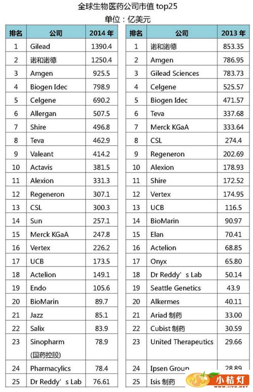 Genengnews.com网站8月4日发布了2014年生物技术公司市值Top25排名。 该排名主要依据各公司7月24日的市场资本总额(MarketCapitalization,普通股股份×股价)计算得来。与2013年7月22日推出的排名相比,Top25的门槛已经从23.2亿美元飙升至76.61亿美元。虽然进榜公司名录有不小变化,排名也有升有降,但总体规模在资本市场追捧下还有极其明显扩张。 亚洲地区有3家公司入围,分别是中国的国药控股和印度的Sun、Dr Reddy’s Lab,国药控股以78.9亿美元排在第23位。
