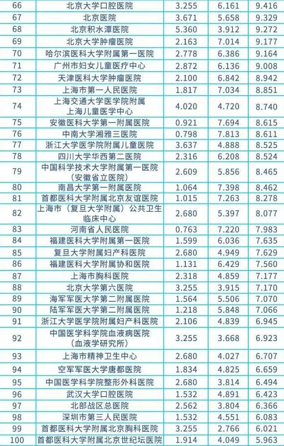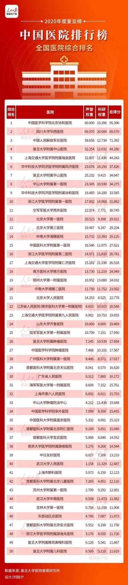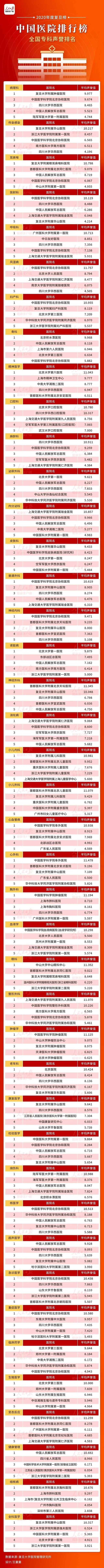 11月20日,复旦大学医院管理研究所在上海发布复旦版《2020年度中国医院综合排行榜》和《2020年度中国医院专科声誉排行榜》,全国共有100家医院进入“复旦版中国医院综合排行榜”,专科声誉排行榜中设置了42个专科。这是复旦大学医院管理研究所连续第十二年发布医院排行榜。 根据排行榜显示,名列排行榜前三甲的医院仍然是中国医学科学院北京协和医院、四川大学华西医院、中国人民解放军总医院。而榜单的第四和第五位换了顺序,复旦大学附属中山医院和上海交通大学医学院附属瑞金医院分列第四和第五名,总分仅相差0.043分。 “这是由于2017年度科研考评机制(权重20%)加入。” 复旦大学医院管理研究所所长高解春解释,科研评分效果较敏感,故需引入科研评比的敏感性来引导、补充声誉评选的滞后性。 在全国医院综合排行榜上,列前10位的医院依次分别是:1中国医学科学院北京协和医院 、2四川大学华西医院、3中国人民解放军总医院、4复旦大学附属中山医院、5上海交通大学医学院附属瑞金医院、6华中科技大学同济医学院附属同济医院、7复旦大学附属华山医院、8中山大学附属第一医院、9华中科技大学同济医学院附属协和医院、10浙江大学医学院附属第一医院。 本年度“专科声誉排行榜”入评学科从40个上升至42个,增加了结核病科和全科医学科。高解春表示,结核病防治工作任重道远,本年度将其纳入其中,就是表示我们不应该忘记为结核病防治工作做出贡献的“他们”;而全科医学的作用越来越大,全科医生对基层常见病多发病诊疗、病人康复及转诊、疾病预防及控制等负有重要职能, 对“健康中国”战略实施至关重要,将其纳入可谓水到渠成,理所当然。 专科榜单中,42个排名第一的医院专科平均声誉值均在9分以上,北京协和医院的风湿病专科在42个专科中得分最高,平均声誉值为11.757。专科声誉值超过10分的医院共34家,涉及31个专科。 深圳市以往从未有医院进入复旦版医院排行榜百强,也没有专科进入声誉排行榜前十名。在本次发布的榜单中,深圳市第三人民医院既进入了医院排行榜百强,且其结核病科也进入了声誉排行榜前五名。 ![]() 2020年度中国医院排行榜 全国医院综合榜 ![]() ![]() 2020年度中国医院排行榜 全国专科综合榜 ![]() 高解春所长介绍,今年榜单的评审专家库人数增加了196名,总人数已达2010年首发时的4.6倍。高解春所长向健康时报记者介绍,最终收到回执再创新高,达3678份,比去年增加了316份;有效回复率高达68.04%,继续领先于已有32年历史的美国最佳医院评选33.5%的专家有效回复率。 高解春强调,复旦版《中国医院综合排行榜》始终注重学科建设和人才建设的重要性,作为被复旦版《中国医院综合排行榜》评选出的国家队“第一方阵”的医院,应该在搞好学科建设的基础上,主动与国家战略“规定”的医疗均等化发展方向接轨、“靠拢”,助推全国优质医疗均等化。 |