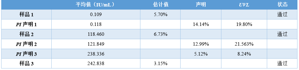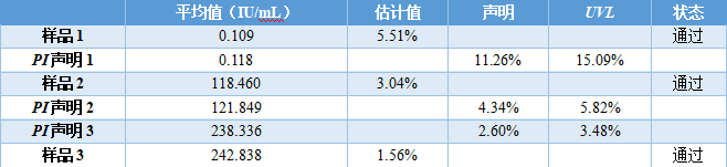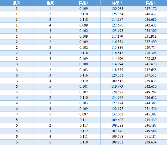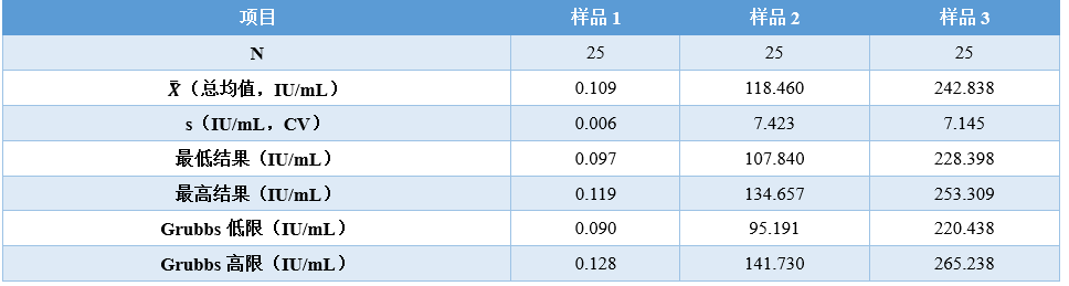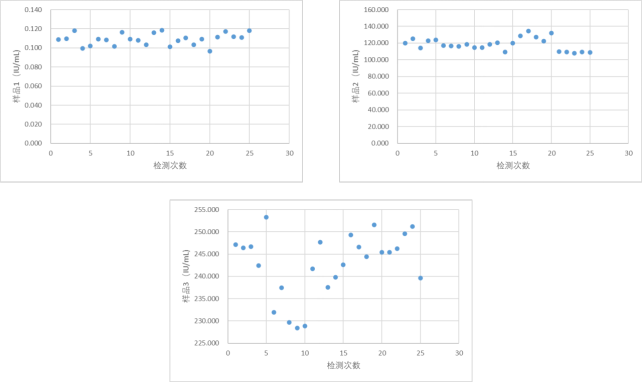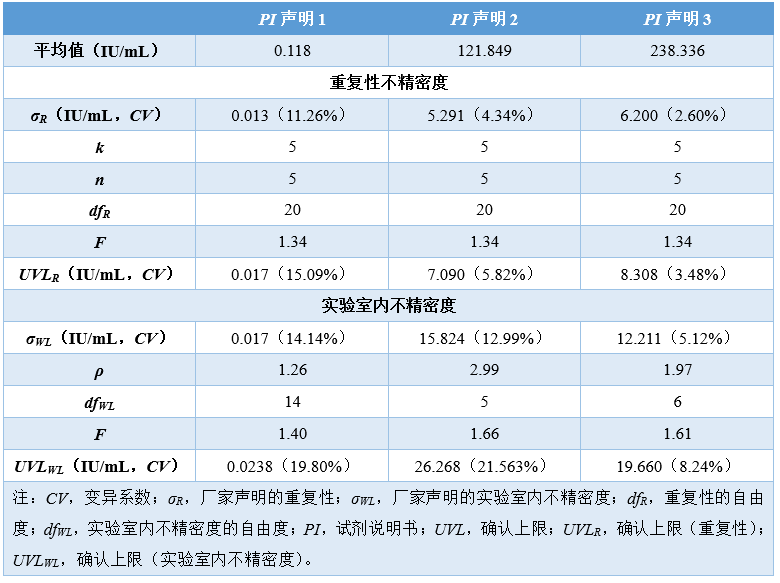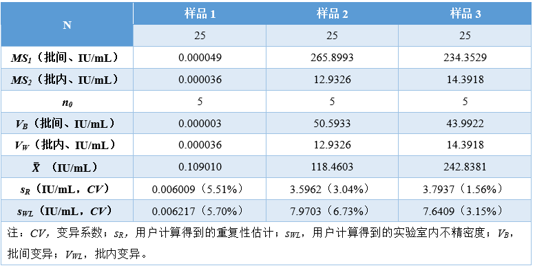 实例 现计划更换HBsAg检测的试剂盒和设备,故对其精密度进行验证。 采用5×5实验设计:5天,每批次重复测量5次,每天单批次检测所有样品。 HBsAg浓度的范围比较大,从0.05 IU/mL到250 IU/mL均有,由于精密度与样品测量浓度有关,当从血液中,测出HBsAg时,就说明该患者可能患有乙肝,而HBsAg浓度降低,则说明该患者的乙肝治疗是有效的。 因此,实验室选择3个浓度样品。收集足够量的临床血清,除了计划的5批次检测,还应多2批次检测的量(如有需要)。 用计划更换的试剂盒和设备检测临界值、中值和高值共3个浓度样品。 为使数据更具代表性,每批次的检测时间可交替安排在早上和下午,每个批次都要检测质控品。 由于PI表上的精密度描述的是进行多次测量系统校准,即使PI要求每个月只校准1次,但实验室在检测每个批次前都应校准。 数据分析之前,每天每批检测完成后,应该观察各样品和质控结果,完成实验后,再次观察。 保证结果没有错误,也没有遗漏结果。 表8是得到的25个原始数据。图3是数据的散点图,显示了批与批之间及各样品每个结果与整个数据之间的一致性分布,初步观察没有离群值。 表 8 HBsAg精密度验证原始数据 (单位:IU/mL) 图3|不同浓度样品按顺序生成的散点图 表9汇总了所有样品数据分析中用到的统计学结果,并用Grubbs法判断各结果是否为离群值。 表 9 HBsAg精密度验证统计分析数据 由于所有结果都在Grubbs低限至高限范围内,所以样品1、2、3数据中没有离群值。 样品精密度的计算结果详见表10。 表 10 HBsAg精密度验证结果和不精密度估计 PI声明:表11是厂家的不精密度数据,本实验中的PI声明数据来自HBsAg检测试剂旧方案的精密度实验检测报告。 表 11 厂家HBsAg不精密度数据 在这个例子中,大多数用户可以直接观察到自己与厂家声明的一致性是通过还是失败的状态,无须再计算多余的UVL。然而,为了举例说明如何应用UVL,下文将提供所有PI声明的UVL。 表12是这个例子的UVL计算。重复性的自由度dfR,根据用户的实验设计,取决于实验实际的批次数量,k = 5,每批次的重复次数,n = 5。 但是,对于实验室内不精密度来说,它的自由度dfWL,不仅仅取决于实验设计还取决于声明的比率 计算得到ρ,从表6得到dfWL。无论使用标准差还是CV表示的这两种类型的精密度,其UVL都是通过乘以相应的UVL的F因子来计算,F因子可从表7获得。 表 12 HBsAg厂家精密度声明的UVL计算 拇指规则的作用:一般来说,UVL至少比相应的精密度声明高30%左右。拇指规则的作用就让接下来严格计算的必要性降到最低。 各样品的评价结果:表13和表14的前5列提供了一个直观的结果,该结果是关于用户如何评价与PI声明和UVL相关的重复性与实验室内不精密度。 表 13 HBsAg精密度重复性的用户样品估计 表 14 HBsAg实验室内不精密度的用户样品估计 该阶段的目标是要判断用户做完实验后,精密度验证是通过还是失败的状态。 本例中估算、声明和UVL都是用CV表示,也可以用标准差表示。 从表10和表11得到平均值,估计值和声明(第2,3,4列)从表12可得到UVL(第5列)。本例中实际上不需要计算UVL,因为通过与声明比较,另外再加上调用拇指规则,可以判断实验是通过还是失败的状态。 样品1、样品2和样品3都明显通过验证,因为它们的重复性估计值比任何一个声明的精密度都要低。 样品1、样品2和样品3都明显通过验证,因为它们的实验室内不精密度估计值比任何一个声明的精密度都要低。 结论:用户的三个样品的重复性和实验室内不精密度的估计值都通过验证,精密度验证实验整体通过。也就是说,用户做实验得到的估计值和厂家PI的声明是一致的。 |