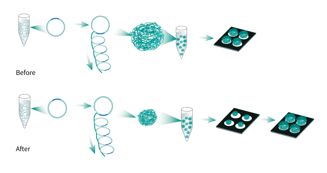 第一步,DNB生成:通过缩短滚环扩增时间获得一批“小个头”的DNB(比如,先只复制扩增100个拷贝数),以此提高DNB的均一性。