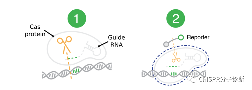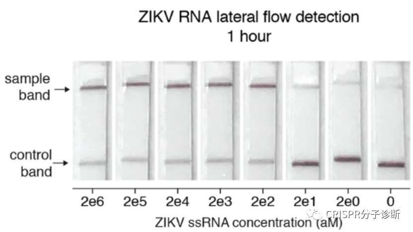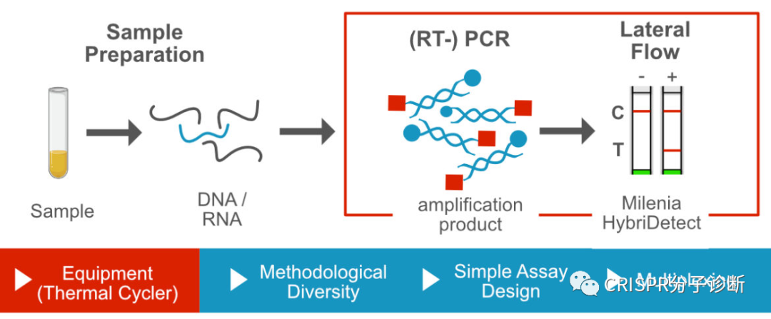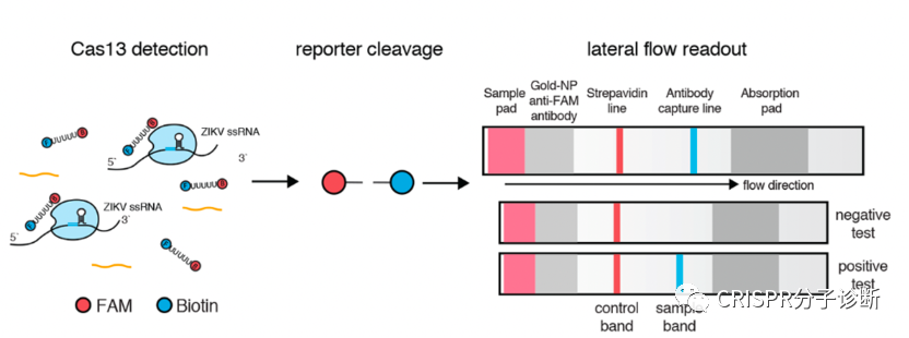 | CRISPR诊断被称为下一代分子诊断技术,美国FDA和中国NMPA都颁发过CRISPR诊断平台的新冠诊断EUA授权,上海伯杰医疗“恒温CRISPR法新冠快检试剂盒”获批的消息进一步激发了大家对CRISPR诊断的热情。CRISPR诊断主要包含样本前处理(含预扩增)、靶标识别、信号释放和检测几部分。本文将主要介绍CRISPR诊断方法所采用的侧向层析信号报告系统CRISPR技术被用于分子诊断主要因为特异性:在向导RNA的引导下,CRISPR-Cas蛋白识别靶标序列的特异性极佳,甚至可以精确区分单碱基差异。另外,Cas蛋白接触靶标序列后会被激活出无差别的反式切割活性,无差别的一阵刀光剑影,将周围一切可切割的核酸序列高效切割,从而起到放大信号的作用。 同时具备特异性识别和无差别切割特征的CRISPR诊断系统简直就是一把装着瞄准器的霰弹枪。  图1. Cas蛋白识别和切割靶标序列的示意图。图片摘自猛犸生物的官方网站。Cas蛋白通过向导RNA特异性识别并结合靶标序列(对于dsDNA靶标,则需要PAM序列),形成三元复合物,在顺式切割靶标序列的同时也激发出反式切割活性,将周围的核酸序列进行无差别的切割。目前,鉴定的有顺式和反式切割活性的Cas蛋白主要集中在Cas12和Cas13两类蛋白,分别识别(/切割)DNA序列和RNA序列。由于Cas蛋白只有在特异地识别和结合靶标序列后才切割周围的核酸序列,因此通过检测报告序列是否被切割就可以判定待检体系中是否存在靶标序列。几乎所有的CRISPR诊断方法都通过向体系中加入某些可被检测的外源探针来完成诊断的流程。张峰团队推出了SHERLOCKv2,引入核酸试纸条作为信号报告系统,非常便于POCT使用。他们在探针的两端分别引入两个小分子标记物FAM和生物素。而他们使用的商品化核酸试纸条将抗FAM抗体用胶体金标记,NC膜上检测线处包被有可结合生物素的链霉亲和素,这种试纸条的原本用途是通过夹心法检测同时含有FAM和生物素的核酸扩增产物。张锋团队则开创性地改变了试纸条本身的判读方式,将这种夹心法试纸条的质控线作为检测线来检测探针是否被切割。他们调整探针浓度,保证在探针未被切割时,所有胶体金都集中在下面那条线,而一旦探针被切割,就会有胶体金越过下面的线到达上面的线显色。 图2. 侧向流层析试纸条工作原理。图片摘自Milenia公司官网。该试纸条开发的最初用途是检测同时含有FAM和Biotin的产品(如上图),在张锋开发出其CRISPR用途后,Milenia公司也在官网展示了其CRISPR诊断方向的用途。图3. CRISPR诊断侧向层析法的工作原理。图片摘自SHERLOCKv2系统 将这种夹心法的试纸条通过竞争法方式进行判读的设计,非常巧妙。好处在于摆脱对仪器的依赖,可以更好地走向POCT。前段时间James Collins团队开发的、火爆全网的、可以检测新冠的口罩系统,也是采用这种方式。但是这种试纸条弊端,必须调整探针浓度适应试纸条。另外,通过这种方式也很难做多指标检测,难以在检测的同时添加内质控,不过这方面已经有一些新进展了。图4. CRISPR诊断侧向层析法的结果解读。图片摘自SHERLOCKv2系统。如上图最右条检测条带所示,在检测阴性样本时,也会出现淡淡的T线,从而会给检测结果的判读带来困扰。 |