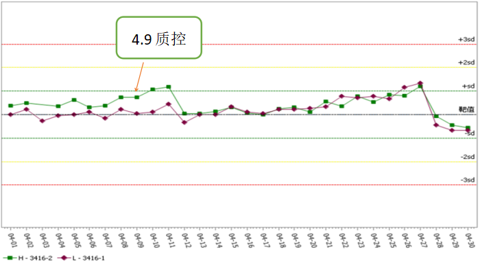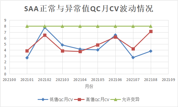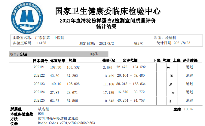 作者 | 沈素晶 陈淑芳 李蔼文 单位 | 广东省第二中医院检验科 室间质量评价(externalqualityassessment,EQA)可为实验室提供外部质量评价,也是卫生行政主管部门和医院管理者对实验室质量监督的重要工具,目前已作为医院绩效考核的指标之一,也是实施检验结果互认的重要手段;因此,室间质评的结果深受检验人的重视。 室间质评计划的成绩要求是 80% 以上为可接受成绩,当收到一份不满意的 EQA 成绩大家都很紧张,但这就代表实验室该项目的检验质量有问题吗?我们又要采取怎样的纠正措施? 案例经过 5 月初的某一天,笔者如常上班,看看日历,估算血清淀粉样蛋白 A(SAA)的第一次卫生部质评的成绩差不多出来,打开网站一看,傻眼了,才 40 分!细看成绩基本都在允许范围上限,都是偏高的(如图 1)。 立即翻看当天质控记录,4 月 9 号质控在控,而且整个月质控稳定良好(图 2)。再翻查当天发出的结果,除质控和质评物并无检测患者标本(该项目平时开单就少)(图 3),一颗心稍稍放一下。面对如此惨不忍睹的 EQA 成绩,笔者决定求根究底。 案例分析 根据 CNAS CL-02(ISO15189:2012)5.6.3.1 参加实验室间比对:实验室应参加适于相关检验和检验结果解释的实验室间比对计划(如外部质量评价计划或能力验证计划)。实验室应监控实验室间比对计划的结果,当不符合预定的评价标准时,应实施纠正措施。 因此,当某个项目的室间质评未通过时,我们应该从哪些方面分析其原因? 根据质量管理的六要素「人、机、料、法、环、测」,从室间质评结果的综合情况分析,主要对人员操作、试剂、仪器、质控、校准、保养等方面加以分析。 1. 排除人为因素:首先查看上报的数据有无填错(如数据顺序、单位、网报时输入错误等),接着方法学和分组上有无错误。科室使用的生化仪为 Roche702,SAA 使用的是开放试剂,试剂、校准品及质控均是广州某生物公司生产的,方法学是乳胶增强免疫透射比浊法。 2. 试剂:存放冰箱温度 2 ~ 8 度,使用均在有效期内,开瓶后使用按照说明书上时间,更换批号均有校准,而且标本比对均在允许范围内,排除批间差异引起失分。 3. 仪器:每年定期校准,每天和每周均有保养,上半年并未发生较大故障,检测当天光源稳定,室内温湿度也达标。 4. 观察室内质控有无趋势性变化:如图 4,2021 年 1 ~ 8 月质控 CV 变化情况不大,均在实验室自己设置的质量目标范围内。 图 4 2021 年 1 ~ 8 月 SAA 低值与高值质控 CV 波动情况 5. 重新将之前冰冻保存的质评标本检测:结果差异不大,排除室间质评物不稳定情况。 6. 查看与其他炎症指标的吻合情况:随机选取 4 月份 5 个患者同一天 SAA 与 PCT、超敏 CRP 的联动情况,符合患者病情变化,如表 1。 那到底是什么原因引起该项目 EQA < 80 呢?经组长提醒,笔者留意到上报网站的临检中心数据分析。经查看,当时上报质评数据最终是归在缺省组,该项目共有 174 家实验室归于缺省组,及格率在 73% ~ 84% 之间(图 5)。而使用跟我们相同公司试剂的实验室的只有 6 家(图 6)其变异系数在 6.7% ~ 18.59% 之间,而按检测仪器上报则有 23 个实验室(图 7),变异系数也在 16.6% ~ 25.07% 之间。 最后,经对比我们实验室所上报数据与按试剂和仪器分组的上报均值相近,这也解释了我们实验室结果偏倚较大的原因。由于缺省组包含不同的仪器和试剂,方法学自然也不尽相同,强硬把这些数据混在一起再统计均值,中位数及标准差必然造成结果的的差异甚至不可比。 到此,谜底揭开,程序上也可以跟领导「交差」了。但是事情并未结束,因为后续还有质评,分组依然在缺省组,该项目的外部质量该如何监测?为此笔者联系厂家咨询,让他们拿数据分析,果然一个月后事情有了转机。 六月初,试剂厂家联系笔者,告知他们经过重新溯源,已重新配置新的定标物和质控品,并寄到科室重新定标。定标液浓度从原来的 145mg/L 变为 108mg/L,6 月 16 号经重新校准做质控,重测卫生部质评物,结果质控在控,质评物浓度全部在上报范围内,即是满分!结果如下: 八月份科室也进行了第二次卫生部质评活动,经过验证,溯源还是很有用,质评成绩虽有偏倚也是满分的,结果如图 8。 总 结 溯源的含义是测量结果或标准量值的属性,它使测量结果或标准量值通过连续的比较链与给定的标准联系起来,给定的标准通常是国家或国际标准。生产 SAA 试剂公司的溯源链如图 9, 溯源报告见图 10。 为什么要溯源?日常工作中实验室里使用不同仪器或者不同的厂家试剂,同一份血清同一个项目出现偏倚不能接受的原因就是实验室没有实现标准化。 国外学者 MauroPanteghini 提出:溯源是医学实验室标准化(唯一)有效途径,量值溯源的一致性也是国际间相互承认结果的前提条件;中国合格评定国家认可委员会(简称 CNAS)将量值溯源视为测定结果可信性的基础。简而言之,溯源能解决检测的准确性问题。 总结本次室间质评过程,从对 EQA 结果的不接纳,追踪原因,重新溯源校准比对,最终找到原因,验证并解决问题。过程颇为曲折和耗时,但是也是值得的。 实际工作中每个实验室或多或少都使用了与检测仪器非配套的试剂和校准品,如何监测这些项目的准确性成为了难题。除了日常质控检测内部稳定性和准确性外,采用室间质评的方法难免遇到分组问题造成结果不可比。 因此,对此种情况的质评项目,笔者建议,一是上报时注意正确填写自己所使用试剂和方法学的