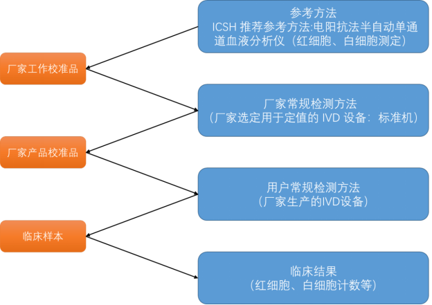 有形成分分析产品主要用于分析样品中可观察到(借助显微镜等工具)的有形成分,如血液样品中的红细胞、白细胞、血小板,尿液中的红细胞、白细附管型、上皮、结晶、真菌等。 对有形成分的分析包括有形成分的分类和有形成分计数。 鉴于目前行业的发展水平,本文仅对有形成分的定量计数准确度评价提供参考建议,对有形成分的分类评价待行业的技术水平突破后再作补充。 目前,分析人体样品中有形成分的方法主要有流式技术和显微镜检验技术,其分析方法均是基于有形成分本身的性质,如有形成分的尺寸、形态和特性等。 这些有形成分不能溶解在基质中,因此其物理形态是一种悬浊液而非溶液。正是基于此,有形成分的定量有其自身特点,在进行准确度评价时需要特别注意。 除了被测量的物理形态具有差异外,作为体外诊断产品的类别之一,其准确度评价的总体方法与生化、免疫等产品有相似之处。 除本文中描述的差异外,之前我们谈到过的评价方法有时也适用于有形成分定量计数产品的准确度评价。 要评价有形成分定量计数产品的准确度,首先要了解该类产品的溯源途径。 流式技术在血液细胞分析中应用较成熟,国际血液学标准化委员会(ICSH)推荐使用电阻抗法半自动单通道血液分析仪计数红细胞(RBC)和白细胞(WBCH)并将其确定为参考方法,也可将其作为血小板(PLT)计数的间接参考方法。 随着新技术的出现,数字成像系统和数字成像自动识别类仪器逐步被研发并投入市场。 和流式技术不同,数字成像类仪器模拟人工显微镜检验流程,通过观察一定体积样品中含有的目标数,在进行等量换算后即可得到单位体积中所包含的目标数(即目标物浓度)。 设观察的视野数为k,观察到第i种类别的目标总数为Ni,每个视野的样品体积为v(μL),则换算后样品中该类目标的浓度(Di)为 公式(1)中,对于给定系统,k和v为常数,不同项目的浓度结果和观察到该项目总目标数成正比,比例系数为 k x v。 该系数只要用其中一种目标物校准即可。 通常对系统定量计数的准确性可采用容易获得的颗粒(如红细胞或红细胞模拟颗粒)来校准。 而用于校准的颗粒则可采用ICSH推荐的电阻抗法半自动单通道血液分析仪来赋值,也可采用人工显微镜计数方法来赋值,但人工细胞计数劳动强度大、重复性差,且操作者需要较高的专业水平,目前已渐渐被自动分析仪所代替。 图1为血细胞自动计数仪分析红细胞和白细胞的参考方法与溯源途径。 图1|血细胞自动计数仪分析红细胞、白细胞的溯源链 1、有形成分定量计数产品的正确度评价 有形成分定量计数产品的正确度评价包括正确度的确认和验证,评价方法与生化、免疫类产品基本相同,即可通过测试参考物质、回收试验和方法学比对等方法进行,具体可参考之前的文章。 对于血液学项目可参考WS/T 406 - 2012《临床血液学检验常规项目分析质量要求》中的「正确度」进行评价。 对于像尿液、粪便、体液等稳定性差的样品,生产厂家在进行正确度确认时,可通过与参考物质或参考测量程序比对进行确认。 由于目前这些有形成分分析项目尚无可用的有证参考物质,往往选择与参考测量程序或更可靠的测量程序进行比对。 考虑到样品中有形成分分布均匀性较差,在进行正确度研究实验时,每个样品的测实次数应不小于3次,样品量许可时,建议测试5~10次,以减少随机误差的影响。 2、有形成分定量计数产品的精密度评价 有形成分定量计数产品的精密度评价包括精密度的确认和验证,由于有形成分产品的特殊性,其确认与验证的方法的和生化、免疫类产品存在一定的差异。 对血液学产品,评价方法可参考WS/T 406 - 2012《临床血液学检验常规项目分析质量要求》中的「批内精密度」和「日间精密度」。 对于尿液、粪便和体液类产品,由于其样品存在稳定性差的特点,不可能在不同的日期测定同一样品,故在进行精密度评价时,只评价重复性(批内精密度)。对于这类产品,目前国内尚无通用的标准可以参考。 对于尿液有形成分分析仪,其精密度评价可按照行业标准YY/T 0996 - 2015《尿液有形成分分析仪(数字成像自动识别)》进行重复性评价。 其他体液可参考2014版《ICSH体液细胞自动计数仪性能和验证》进行精密度评价,应尽可能对所有可能影响产品的变异因素进行评价。 用于精密度评价的测试样品应与临床样品具有相同的特性。 建议检测2个或多个浓度的样品。所有样品应至少测定10次。如果测定10次有困难,则应视可用的样品量而定,但为了能有效统计,至少应检测5次。如果患者样品不稳定,可用相应的质控品代替样品进行评价。 另外,基于有形成分的特殊性,在进行精密度评价时,需要对混匀方法特别关注。 有形成分定量计数产品的关键成分是细胞或模拟细胞颗粒,细胞型试剂按现有技术尚不适宜采用冻干形式封装,有形成分不能溶解在基质中,其物理形态是一种悬浊液而非溶液,很难保证分布均匀。 因此在评价精密度时,需要注意使用前的混匀方式。混匀时既要保证其中的有形成分分布充分均匀,又要防止有形成分破碎或聚集,因此不可采用过于剧烈的混匀方法。 对液体有形成分定量计数产品的手工混匀可采用颠倒混匀、手指拨动等。 由于手工操作存在个人手法的差异,因此操作的力度和时间需根据个人的实际情况摸索确定。 对于颠倒混匀方式,要注