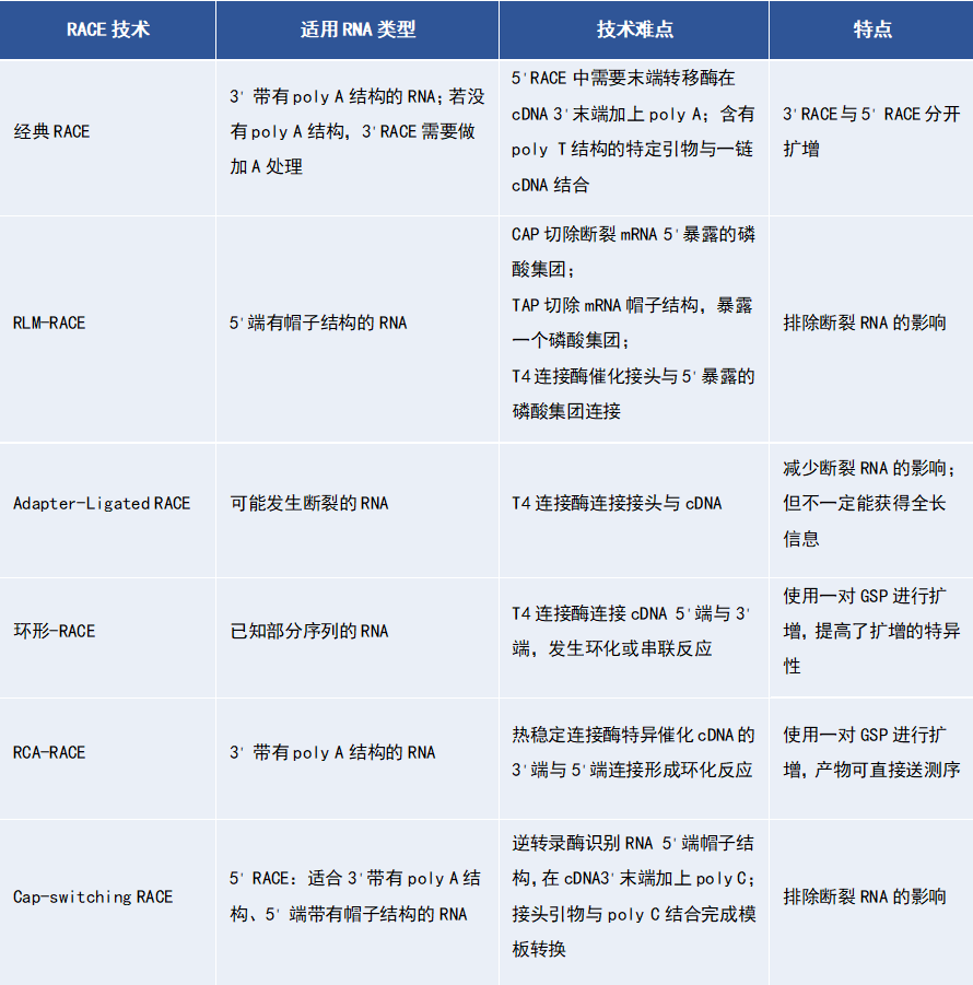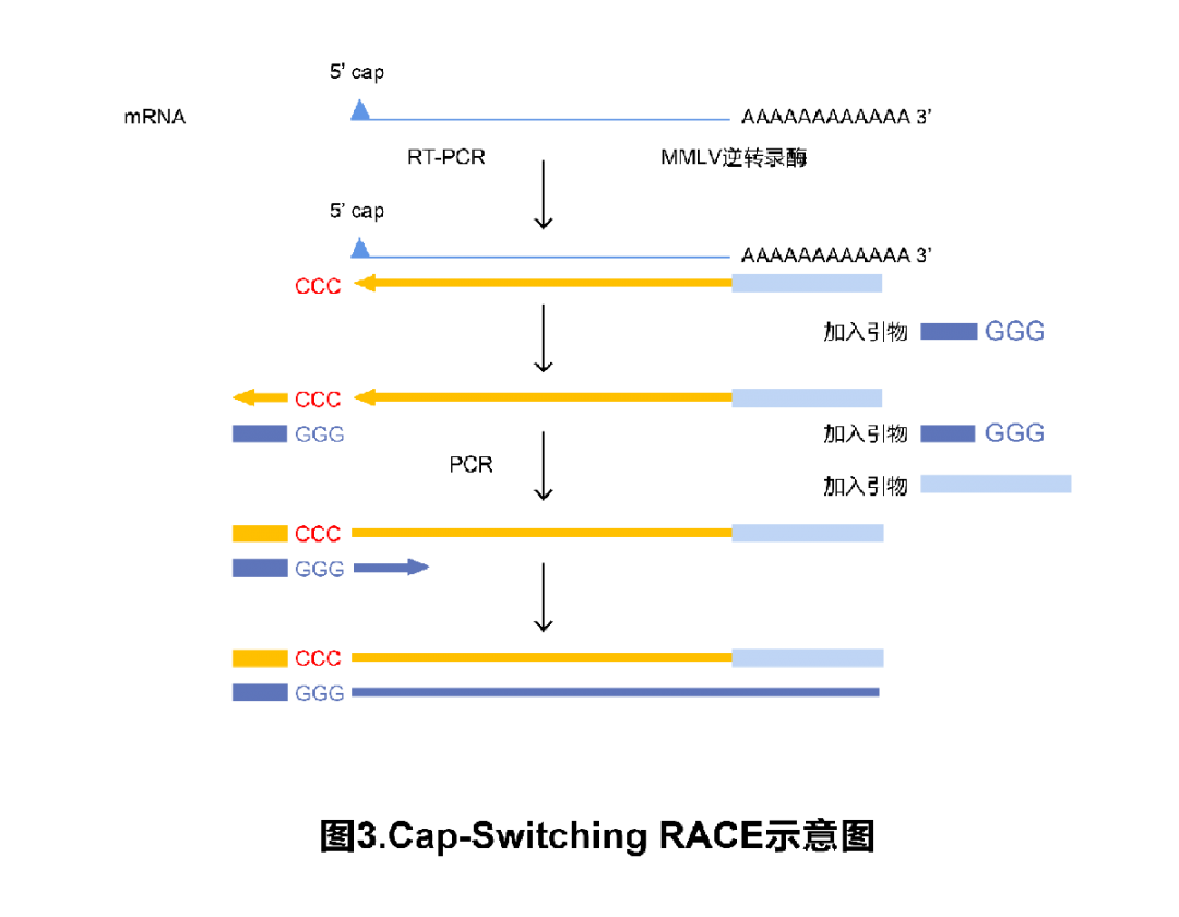 背景介绍 RACE是什么? RACE可以应用在哪些实验方向? 构建cDNA文库 lncRNA全长克隆 获得抗体可变区序列 miRNA靶基因序列验证 已知基因一段序列,克隆旁侧序列 获得病毒基因组 ...... RACE技术类型及特点? RACE技术有多种类型,根据各个RACE技术原理的不同,适合于不同的RNA,快来跟着小V一起来了解下吧~ 经典RACE 经典RACE技术是在1988年由Frohman等[1]发明。经典RACE技术包括5'RACE和3'RACE,分别克隆cDNA的5'端和3'端。 1. 3'RACE利用真核生物mRNA 3'端具有poly A结构的特点,使用5'端带有接头序列的oligo dT与之结合进行逆转录,获得cDNA; 2. 再利用根据已知序列设计的上游引物和与接头序列互补配对的下游引物进行PCR扩增,得到cDNA 3'末端扩增产物。 1. 经典RACE技术中的5'RACE是利用根据已知序列设计的下游引物GSP作为逆转录引物,合成一链cDNA; 2. 末端脱氧核苷酸转移酶在新合成的cDNA 3'末端加上poly A; 3. 带有接头序列的Oligo dT引物与一链cDNA 3'末端的poly A结合,合成二链cDNA; 4. 再以第二链cDNA为模板,利用GSP和接头引物作为上下游引物进行PCR扩增,得到cDNA 5'末端扩增产物; 得到的5'末端产物和3’末端产物可以通过克隆连接到适当的载体上,进行测序获得末端序列。将测序得到的cDNA末端序列,与已知的中间序列进行拼接,就可获得cDNA全长序列。 经过科学技术的发展,由经典RACE又衍生出多种RACE技术,增加了RACE技术的适用广泛性,我们再来一起了解下其他的RACE技术吧! Cap-switching RACE Cap-switching RACE针对mRNA发生断裂的可能,进行了技术优化[2-4]。 1. Cap-switching RACE是以Oligo dT作为逆转录引物,逆转录获得一链cDNA; 2. 当逆转录到mRNA的5'帽子结构时,莫洛尼鼠白血病病毒逆转录酶(MMLV)会在新合成的cDNA的3'末端加上若干个胞嘧啶; 3. 接着,使用5'端带有接头、3'端带有poly G结构的接头引物与cDNA 3'端的poly C互补配对,逆转录酶继续以接头为模板合成cDNA,完成接头转化,新合成的一链cDNA 3'端就含有一段接头序列; 4. 然后再利用接头引物进行PCR获得RACE产物。 RLM-RACE RLM-RACE技术的出现同样也是为了扩增到完整mRNA的5'末端,避免mRNA断裂带来的影响。 1. 首先在RNA体系中加入牛小肠碱性磷酸酶(CAP),特异性地识别并切除断裂mRNA 5'端暴露的磷酸基团; 2. 再向体系中加入烟草酸焦磷酸酶(TAP),切除mRNA 5'端完整的帽子结构,使mRNA 5'端暴露出一个磷酸基团; 3. 接着加入RNA连接酶将接头与mRNA 5'端暴露的磷酸基团连接,而切除了磷酸基团的断裂RNA则不能与接头结合,这样便获得了5'端带有接头的完整mRNA; 4. 最后再进行RT-PCR。 Adapter-Ligated RACE Adapter-Ligated RACE技术同样是为了获得更长的mRNA序列,但相对来说不一定能获得全长mRNA序列[5]。 1. 向逆转录获得的cDNA体系中加入T4连接酶,利用T4连接酶将接头连接到cDNA两个末端上; 2. 短cDNA的退火温度低,两端接头容易发生退火,形成锅柄状结构; 3. 长的cDNA退火温度高,不易形成锅柄装结构,因此引物可以与接头结合,进行PCR扩增。 环形-RACE 环形-RACE使用一对基因特异性引物进行扩增,提高了PCR扩增的特异性[6]。 1. 环形RACE是利用T4连接酶将cDNA的末端连接,形成cDNA的环化结构或串联结构; 2. 根据mRNA上的已知区域设计特异性引物GSP,以GSP引物合成第二条cDNA链; 3. 在未知序列两端根据已知序列设计一对GSP进行PCR扩增,将未知序列置换到已知序列中间位置,得到中间是未知序列、两端是已知序列的扩增产物。 RCA-RACE RCA-RACE (rolling circle amplification rapid amplification of cDNA ends)类似于环形RACE,但是RCA-RACE在环化的过程中并不会产生串联结构,PCR扩增过程中所使用的引物既可以是特异性引物,也可以是随机引物。PCR扩增使用φ29聚合酶,这种酶的特点是会把酶前行方向上的前链从原来的模板链上进行解链、移开。RCA-RACE利用这种特点,可以让模板上的每个点在第一轮反应中,都有机会得到n个拷贝,产物呈指数扩增。 RACE的技术特点对比 基于RACE技术原理,以下几点可提高RACE实验的成功率: 1. 保证RNA模板的完整性。实验之前最好进行琼脂糖凝胶电泳验证RNA完整性。 2. 使用高特异性引物。如使用Vazyme官网的RACE引物设计软件,软件会给出多条合适的RACE引物,可选择多条基因特异性引物进行RACE实验,提高成功率。 Vazyme可以提供 HiScript-TS 5'/3' RACE Kit(Vazyme #RA101)基于Cap-switching RACE原理开发,试剂盒中包括5'RACE和3'RACE的所有组分,可分别获得5'RACE和3'RACE的产物。 原理图如下: 成功率高:经测试RA101阳性率可达到70 %以上 操作流程简便、体验感优:步骤简化,一管内完成模板转换和一链cDNA合成;组分Mix形式,减少加样步骤、降低加样所带来的污染 配套RACE引物设计软件和序列比对软件:官网包含RACE实验引物设计软件和序列比对软件,以及使用说明文件,简化RACE实验设计环节 【参考文献】 [1] Frohman M A,Dush M K,Martin G R. Rapid production of full-length cDNAs from rare transcripts: amplification using a single gene-specific oligonucleotide prime[J]. Proc. Nat. Acad. Sci. USA,1988,85( 23) : 8998 - 9002. [2] Matz M,Shagin D,Bogdanova E,et al. . Amplification of cDNA ends based on template-switching effect and step-out PCR[J]. Nucl. Acid Res. ,1999,27( 6) : 1558 - 1560. [3] Schramm G,Bruchhaus I,Roeder T. A simple and reliable 5- RACE approach[J]. Nucl. Acid Res. ,2000,28( 22) : e96. [4] Schmidt W M,Mueller M W. CapSelect: a highly sensitive method for 5'CAP-dependent enrichment of full-length cDNA in PCR-mediated analysis of mRNAs[J]. Nucl. Acid Res. , 1999,27( 21) : e31. [5] Chenchik A,Diachenko L,Mo