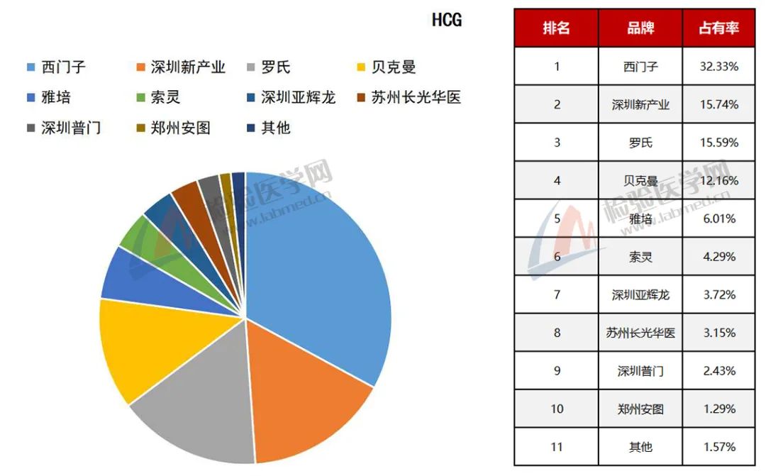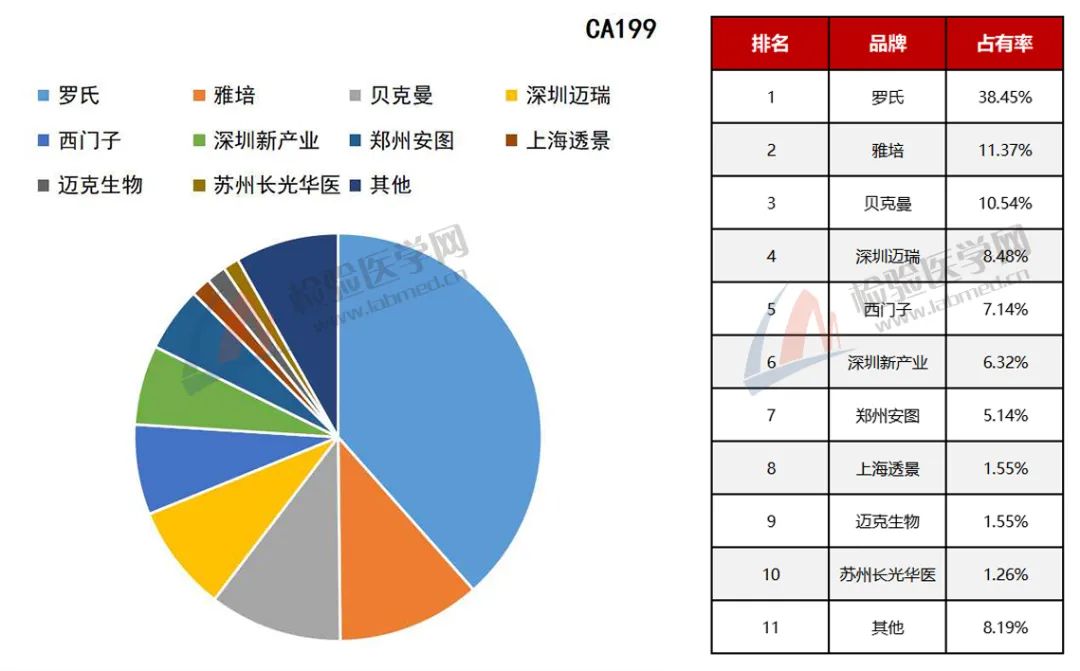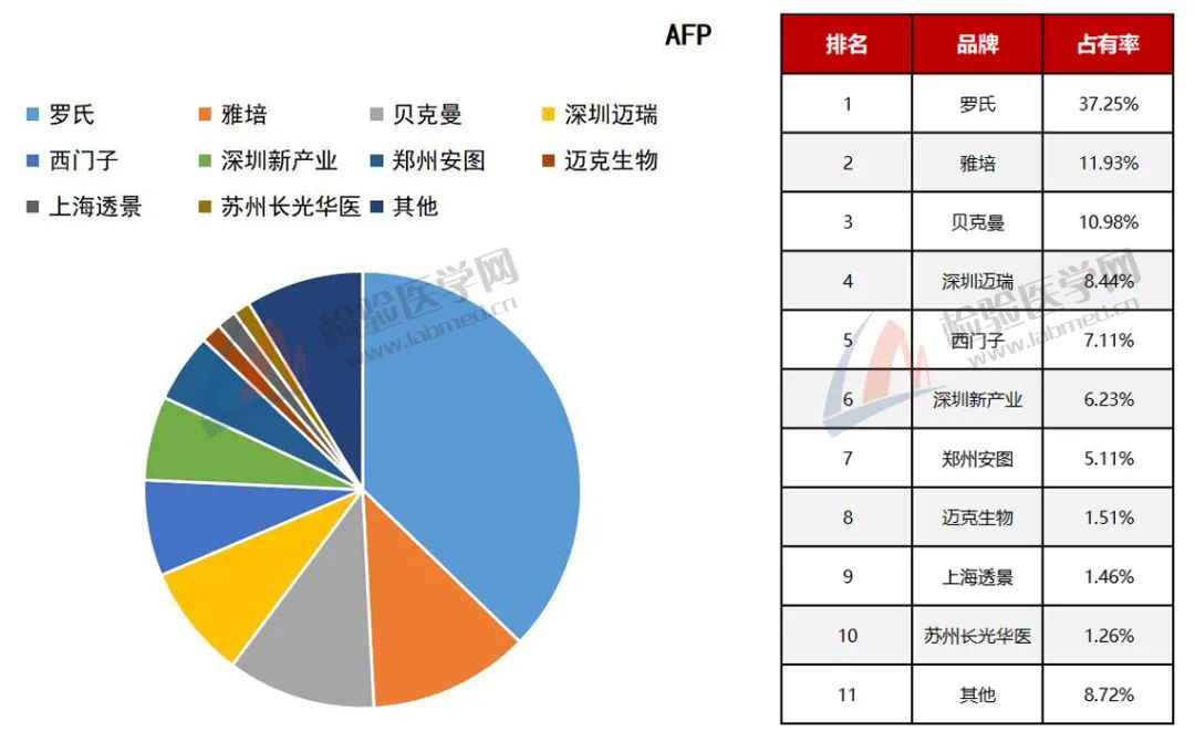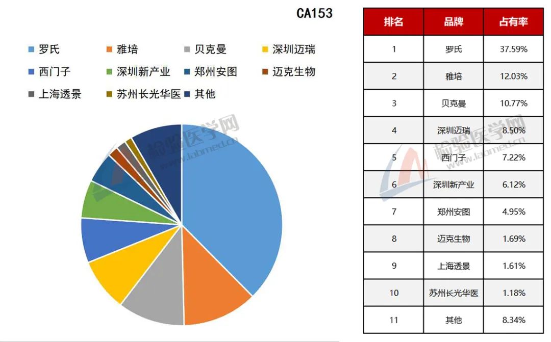 肿瘤标志物是机体适应肿瘤的生长而产生的或肿瘤组织自身所产生的蛋白,可在血液、尿液或者组织标本中检测到。某些肿瘤标志物有特异性,而其他的标志物可在不同类型的癌症中出现。许多已知的肿瘤标志物也可见于未患肿瘤个体中。无庸置疑,肿瘤标志物本身对癌症而言都是非诊断性的。 以下表格统计包含国内3000多家各等级医院检验科及独立医学实验室的检验、仪器试剂使用情况,以下数据截至2021年11月1日。