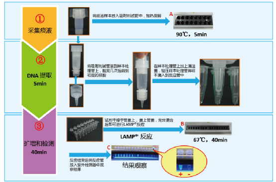 蓝谱生物为该产品从样本采集(咳痰采集专用移液枪/枪头)到样本处理(PURE法)再到结果检测(恒温荧光核酸扩增仪LoopampLF-160),配齐了一套适合该产品实验操作的耗材、试剂和设备。总体上,操作方法相对简单,其中样本处理过程中的耗材设计较为巧妙,最后经LAMP扩增的终产物可在紫外光照射下肉眼观察判读。