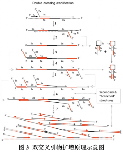 ①首先,交叉引物2a-1s(以2a-1s为例)的1s序列与模板1a区域结合引导合成DNA链,同时剥离引物3s引导合成DNA链,并置换出交叉引物的合成链(图3 step1);②被置换出的DNA单链包含2s和4s区域,可分别与交叉引物1s-2a的2a序列和剥离引物4a结合引导合成DNA,其中剥离引物4a引导合成的DNA将置换出交叉引物的合成链(图3 step2);③被置换出的单链DNA序列为5’-1s-2a-NNN-1a-2s-3’,自身含有互补配对序列1s/1a和2s/2a,可形成2种发夹结构;其中2s/2a形成的发夹结构由于存在游离3’端,可继续延伸补平至末端;同时,该单链DNA的3’端1a和2s区域可分别与交叉引物2a-1s的1s序列、交叉引物1s-2a的2a序列结合引导合成DNA链,其中位于外侧的交叉引物1s-2a的合成链序列为5’-1s-2a-1s-NNN-2s-1a-3’(图3 step3-4);④序列为5’-1s-2a-1s-NNN-2s-1a-3’的DNA合成链,3’端的1a和2s区域可继续分别与交叉引物2a-1s的1s序列、交叉引物1s-2a的2a序列结合引导合成DNA链,由此不断往复延伸,引入交叉引物序列,终产物是具有各种二级结构的多分支单链DNA和双链DNA混合物(图3 step5-7)。