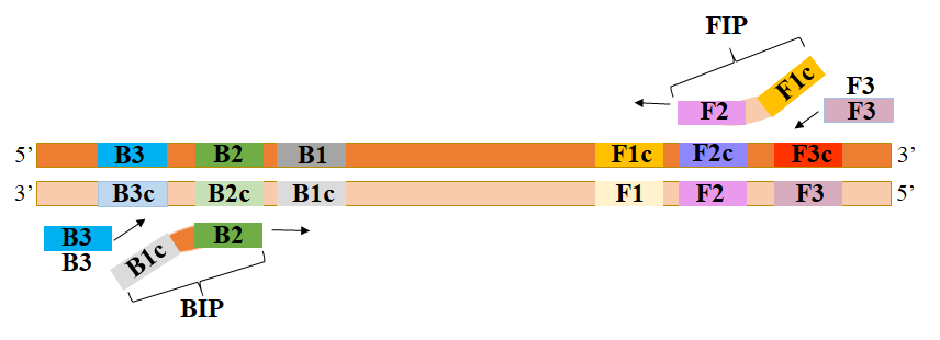 ①LAMP关键步骤是形成环状结构,而理解了环状结构的形成过程及其作用,也就理解了LAMP原理。通过上述反应步骤可以知道,环状结构有两个作用,一个是3’端成环后可以自身为模板引导扩增,另一个是环状部分的单链结构可与内侧引物退火结合启动扩增,可见该恒温扩增方法的关键步骤是形成环状结构,引导循环扩增,这可能正是该恒温扩增技术命名的缘由。②Bst DNA聚合酶的链置换功能是该恒温扩增技术的核心,只有置换出单链DNA,才有可能形成环状结构。③从反应过程看,参与循环扩增的引物主要是内侧引物,外侧引物仅在开始时置换出内侧引物的合成链,以便形成单链并互补配对成环,因此在LAMP反应体系中内侧引物的浓度高于外侧引物。