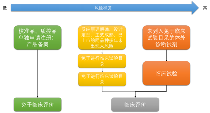 2.3、临床评价 图2|医疗器械临床评价模式 这次条例修订过程当中,NMPA根据新条例的内容对医疗器械的临床评价进行了改革。 对于医疗器械产品来,它们的临床评价采用这样一个模式,将其风险程度从低到高进行评估,并且可以分别采取免于进行临临床评价、同种医疗器械比对和临床实验这样三种方式进行。 图3|体外诊断试剂临床评价模式 但对于体外诊断试剂产品而言,它的组成和成分,并不像医疗器械那样明显,基本都在溶液当中,很难进行区分,所以很难通过纯信息对比的方式,来对体外诊断试剂进行同品种评价。 而且,对于体外诊断试剂产品而言,一个细小的差异,例如,PH值的差异,或者缓冲体系的差异,就会造成临床性能上的显著性的差异。 正因为如此,体外诊断试剂的临床评价模式和医疗器械之间存在一些不同点。 对于体外诊断试剂产品而言,免于进行临床评价的产品限定在校准品、质控品单独申请注册,以及第一类体外诊断试剂产品备案时,是可以免于临床评价的。 而对于反应原理明确、设计定型、工艺成熟、已上市同品种多年没有严重不良事件的产品,是可以免于进行临床实验的,这些产品会列入免于进行临床实验目录当中。 对于这类产品,可以使用临床样本进行同品种方法学比对的方式,来进行临床评价。 而对于未列入免于进行临床实验体外诊断试剂目录中的产品,则要通过进行临床实验的方式来进行临床评价。 这就是体外诊断试剂临床评价和医疗机械临床评价的最大区别。 2.4、临床实验管理 这些年,体外诊断试剂临床实验管理方面的规范性是不够的,还存在很多不规范,不真实的情况,所以为了进一步加强体外诊断试剂临床实验的管理工作,将5号令中的第三十二条 临床机构数量、第三十三条 一般要求、第三十四条 统计学要求、第三十五条 境外临床评价资料和境内人种差异分析、第三十六条 总结报告要求、第三十八条和第三十九条 临床试验的罚则,这些临床实验管理方面的内容,都进行了删除,不再48号令当中在进行表述了。 这部分内容纳入了医疗器械临床实验质量管理规范的范围,这是这次体外诊断试剂临床实验管理方面一个非常大的变化。 也就是说今后的体外诊断试剂临床实验管理是要按照医疗器械临床实验质量管理规范的要求,在有条件并且经备案的临床实验机构来开展。 在今年5月10日,NMPA已经开始在对《医疗器械临床实验质量管理规范》公开征求意见,我们后面也会专门做一期《医疗器械临床实验质量管理规范》的具体解读。 2.5、变更注册 为了落实条例当中关于变更的相关的规定,在体外诊断试剂办法当中,也对变更做了相应的调整,按照变更注册、备案和报告三种模式来设定产品变更的相应的路径。 变更注册的内容包含产品名称、包装规格、主要组成成分、预期用途、产品技术要求、产品说明书、进口体外诊断试剂生产地址变更等内容。 备案的内容包括注册人名称和住所、代理人名称和住所、境内医疗机械生产地址变更等内容。 如果发生了其他变化,则应该按照相应质量管理体系的要求做好相关的工作,并按照规定向药监部门进行报告。 这个是在新条例框架下,对于变更注册管理的三个方面,整个变更管理,也是按照注册证及其载明事项,以及加上具体的变更情形,来限定变更的内容。 在以往的执行过程当中,我们往往会有这样的困惑,就是我到底是依据的是注册证及其附件载明的事项来变更,还是要按照法规列明的变更事项来变更。 这个问题在具体执行过程中,会经常遇到。 所以在这一次办法修订过程中,对这方面进行可修改,将5号令当中规定的变更具体情形,包括主要原材料供应商、检测条件、技术要求、包装规格、适用机型、储存条件、有效期、预期用途和其他这些内容,都在48号令中予以删除。 只是在法规中规定,变更范围包括注册证及其附件载明内容,如果发生了变更,再按照上述三种情形来进行变更申请。 另外,还需要注意,为了更好,更科学的来对变更的相应内容进行审评,在变更当中,也引入了风险分析的理念。 就是要针对具体的变更情形,进行风险分析,并且根据风险分析的结果,开展相应的产品设计或者验证,确认变更的安全性和有效性。 2.6、独立试剂组分销售 这个方面呢也是在本次办法修订当中新增的内容,主要考虑到现实的工作当中,由于体外诊断试剂产品的特殊性,临床检验机构在使用的过程当中经常出现相应的组分没有同步使用完,或者有点不太够的情况,特别是像校准品、质控品、通用底物等等。 在器械的注册管理办法中规定: 在注册证中「结构及组成」栏内所载明的组合部件,以更换耗材、售后服务、维修为目的,用于原注册产品的,可以单独销售 借鉴医疗器械的经验,在试剂办法中也引入了相应的条款: 注册证「主要组成成分」栏内所载明的独立试剂组分,用于原注册产品的,可以单独销售。 这个条款设立的目的是希望能减少一些试剂不必要的浪费,然后也是减少企业为了销售试剂和里边的一些部件,不断的拆分注册证,给企业和监管部门都带来了巨大的,不必要的成本。 2.7、医疗机构自研试剂 这部分内容是大家非常关注的内容,在48号令当中,这条内容是落实条例第五十三条的规定,是条例的要求在办法当中的体现。 当然我们也可以看到,在48号令当中的内容与条例当中的表述基