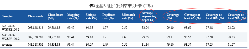 图1 全基因组上的比对结果统计表此表引用自华大科技人重WGS的demo报告中,红圈标注的分别就是测序深度(depth)和测序覆盖度(coverage)。