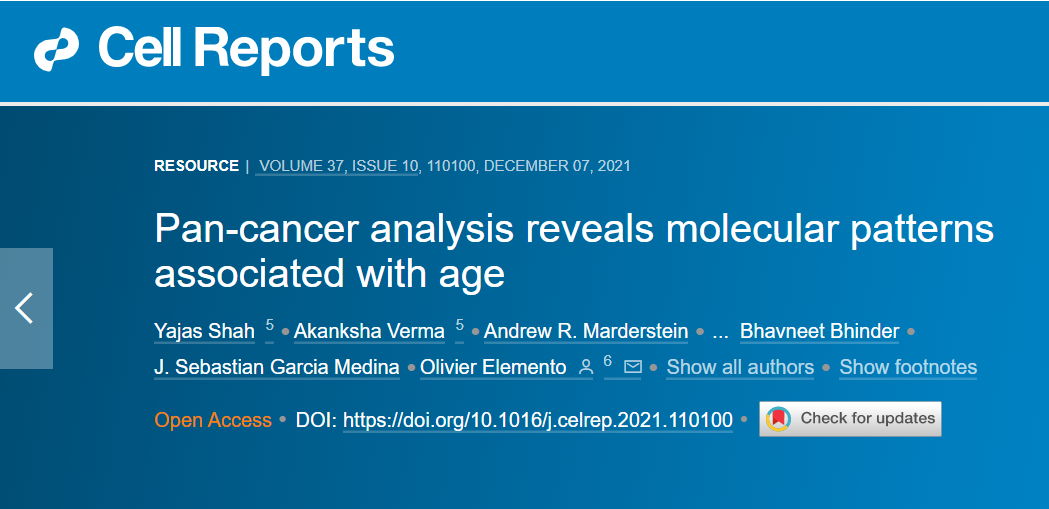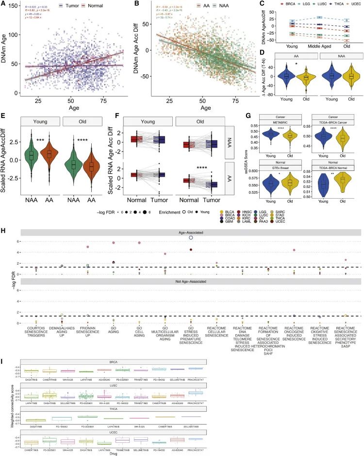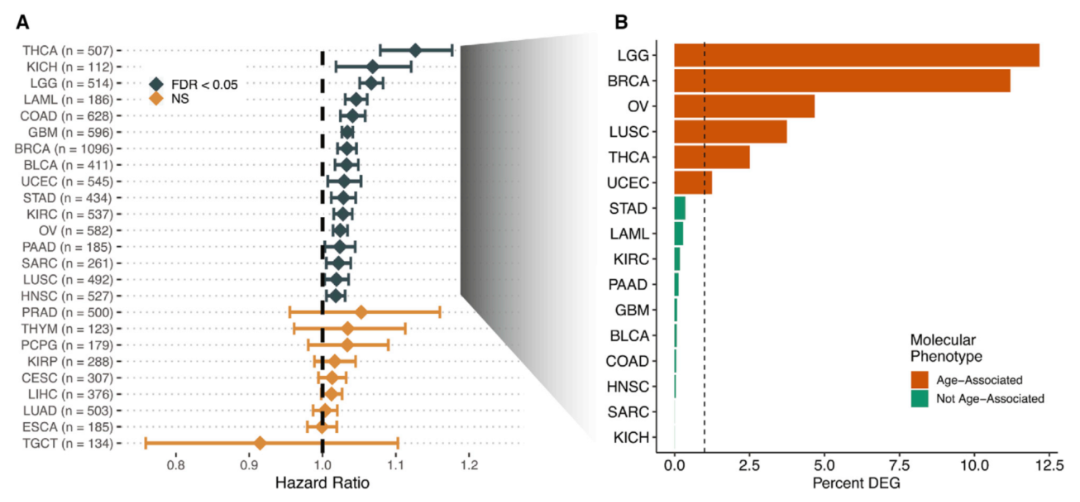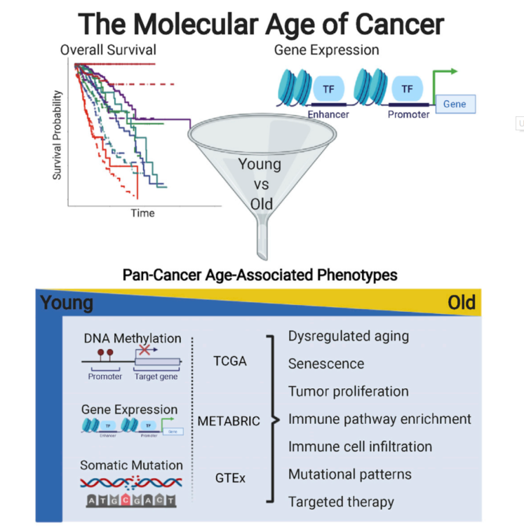 " 近日,美国威尔康奈尔医学院的研究人员对癌症基因组图谱(TCGA)队列进行了泛癌系统分析,以阐明年轻肿瘤患者和老年肿瘤患者之间的的分子特征是否存在差异,并发现年轻个体的肿瘤具有可用于设计新疗法的独特特征。 衰老是指生理功能随时间下降,导至患病风险增加,包括癌症。 癌症,一般都是在老年人中诊断出来。年龄较大是癌症的一个重要危险因素,但近年来,年轻人的癌症发病率正在以惊人的速度增加。1,2,3 在美国,根据最近的一份报告,在49岁以下的男性和女性中,有1/29和1/17的概率会罹患癌症。4 乳腺癌,结直肠癌,生殖道肿瘤,皮肤癌,软组织肿瘤和甲状腺癌在这个年龄阶段最常见。 但目前,我们对癌症年龄相关的病因学和生物学差异了解知之甚少。