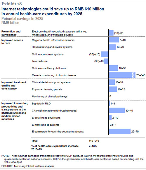 据麦肯锡全球研究所7月份最新公布数据消息,从2013年到2025年,互联网技术每年可为中国医疗支出节省1100亿到6100亿,这将占据医疗支出项目增量增长额的2%到13%。同时,这种更低的花费和提升的效率也将会导至包括医药公司、医疗设备公司和医院在内的7万到30万工作岗位的消失。 ![]() 麦肯锡研究报告称,患者们看重的则是这些支出节省背后可以带来的好处。随着医疗越来越贴近生活并且支付得起,越来越多的患者想获得相关服务,而且会花更多的钱用于在线应用和可穿戴设备。最终,这些改变会因为创新让系统更加多样多产而导至医疗花费的整体下降。 医药公司和医疗设备公司可以在目标市场和其他领域使GDP获得增量增长。互联网在帮助病人减少花费的同时还可以满足人们日益增长的需求。随着基于互联网技术的整合,医院在拥有固有医生数量的时候也可以为其他地方的病人提供治疗方案。同时,初级诊疗越来越重要,全科医生的需求量也越来越大,医生移动设备的使用也同样越来越重要。医药和医疗设备公司将会因为越来越高效而需要更少的劳动力。 随着医疗支出费用的直接节省,更有效的医疗系统会带来巨大的间接经济利益。更好的治疗结果和更加方便获得医疗信息和资源的路径会帮助患者节约大量的时间和金钱。不仅在大城市的医院里就医等待时间会减少,农村的患者也可以不用奔波,大医院可以通过远程医疗让偏远地区患者面对面进行咨询。 |